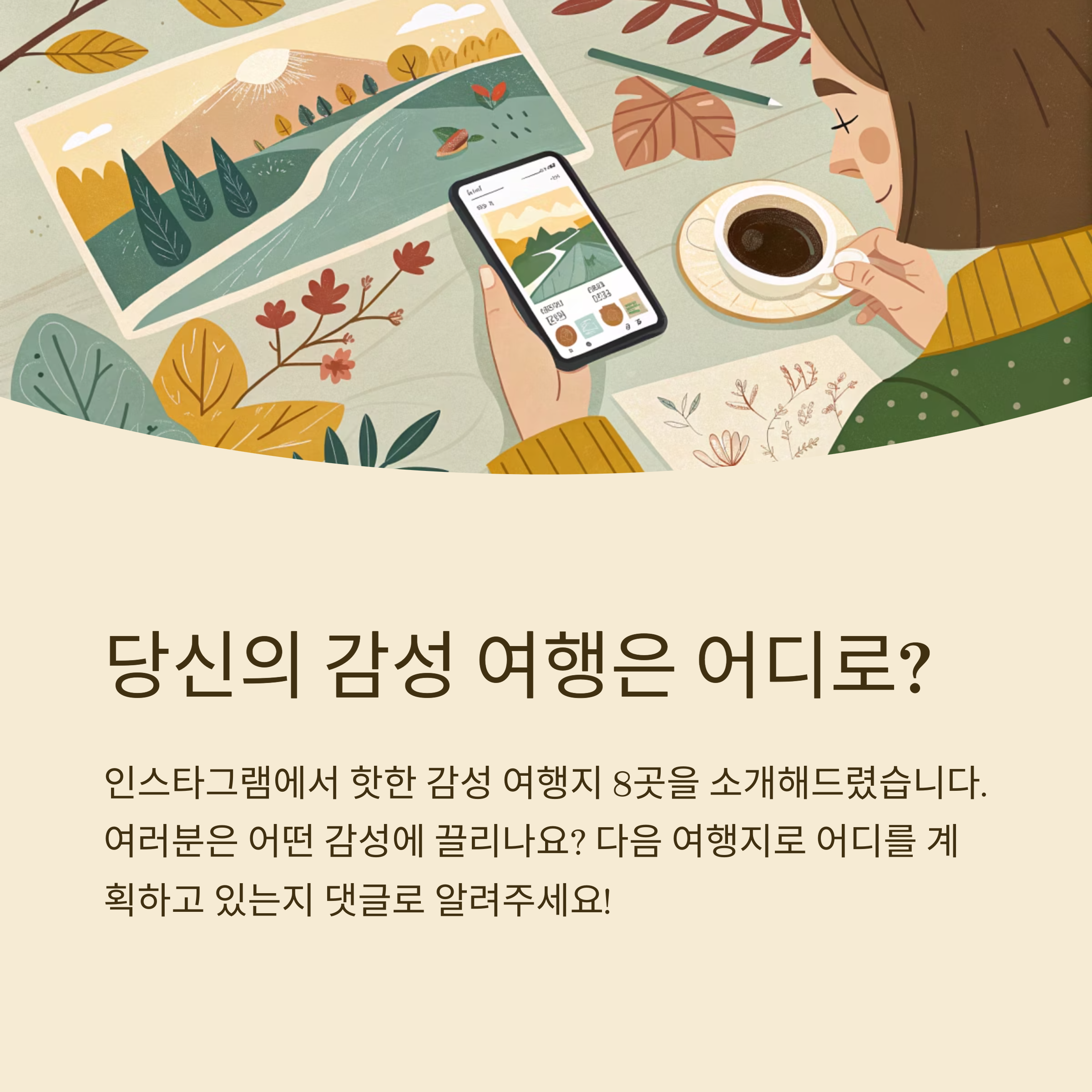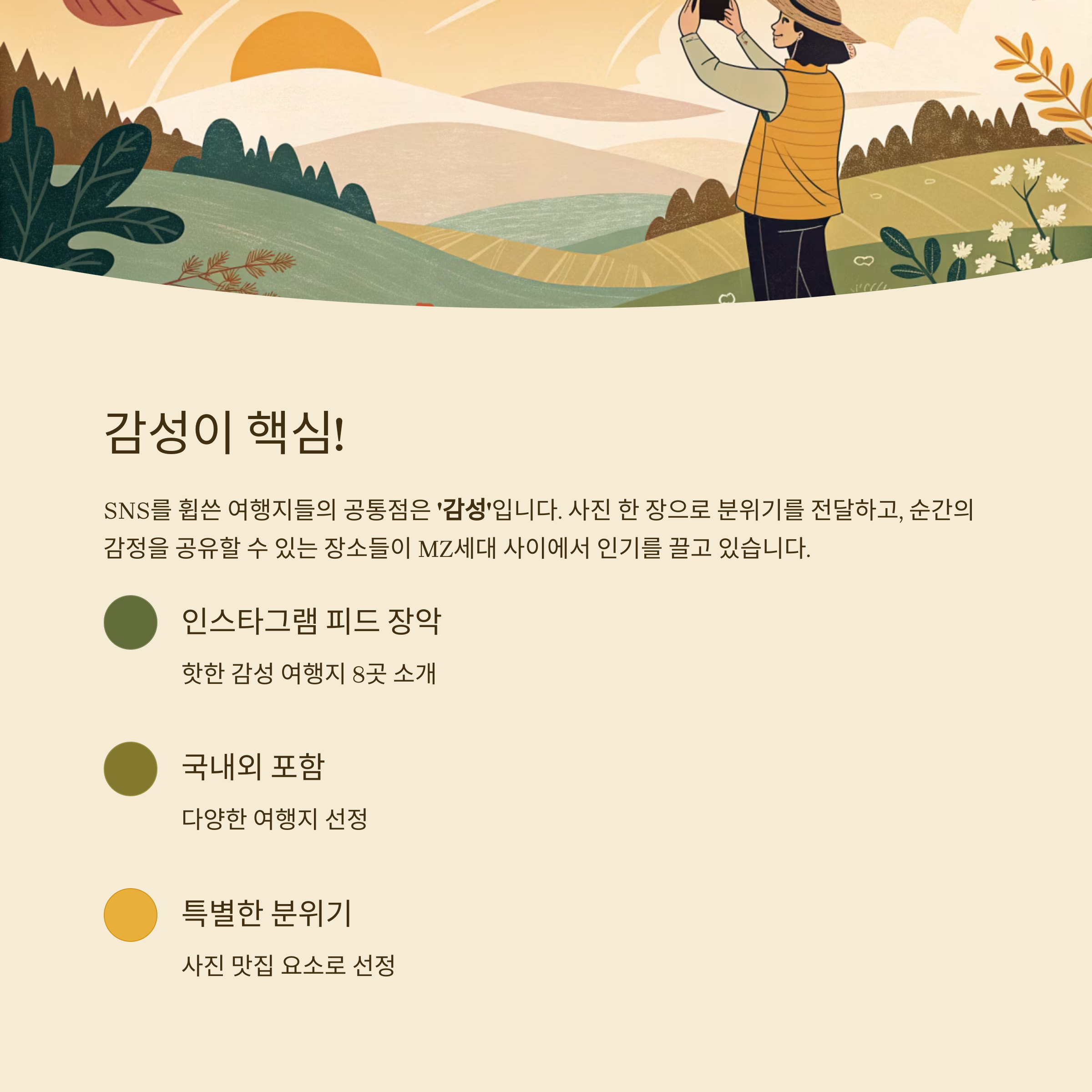 SNS를 휩쓴 여행지들의 공통점은 무엇보다 **'감성'**입니다.