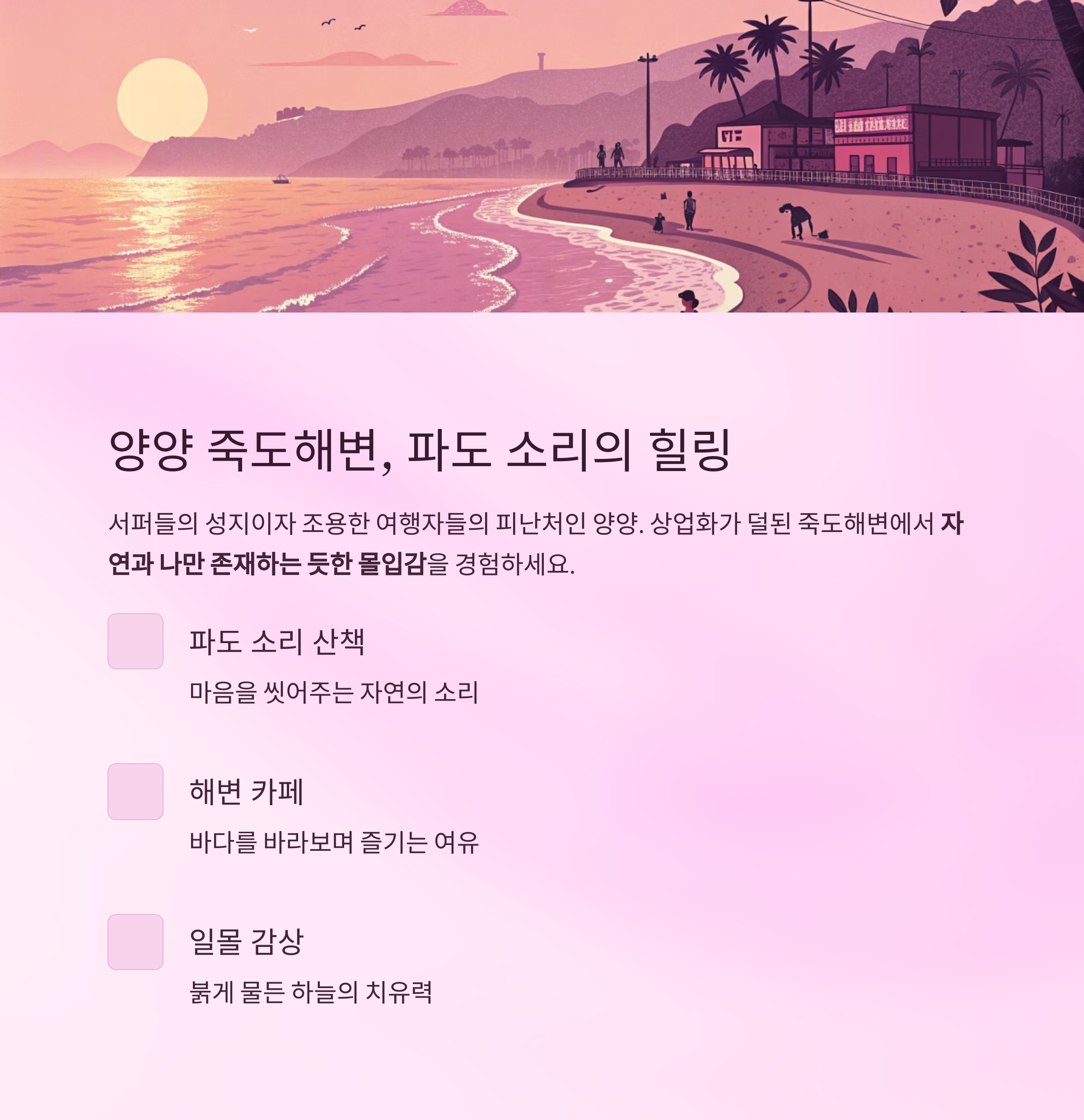 | 2 | 양양 죽도해변 | 파도소리 산책 | 여름~가을 |