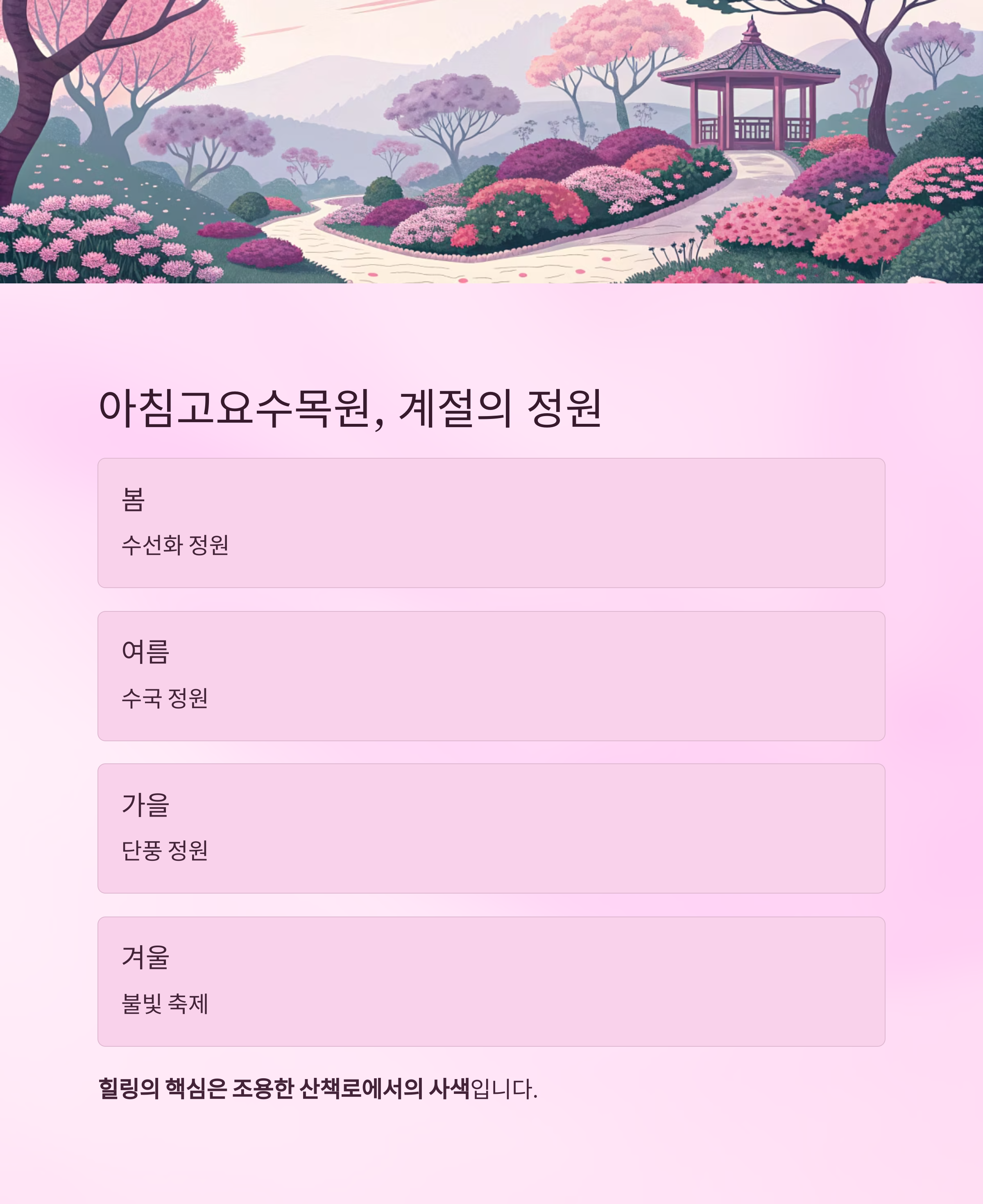 | 1 | 아침고요수목원 | 사색 산책 | 사계절 모두 |