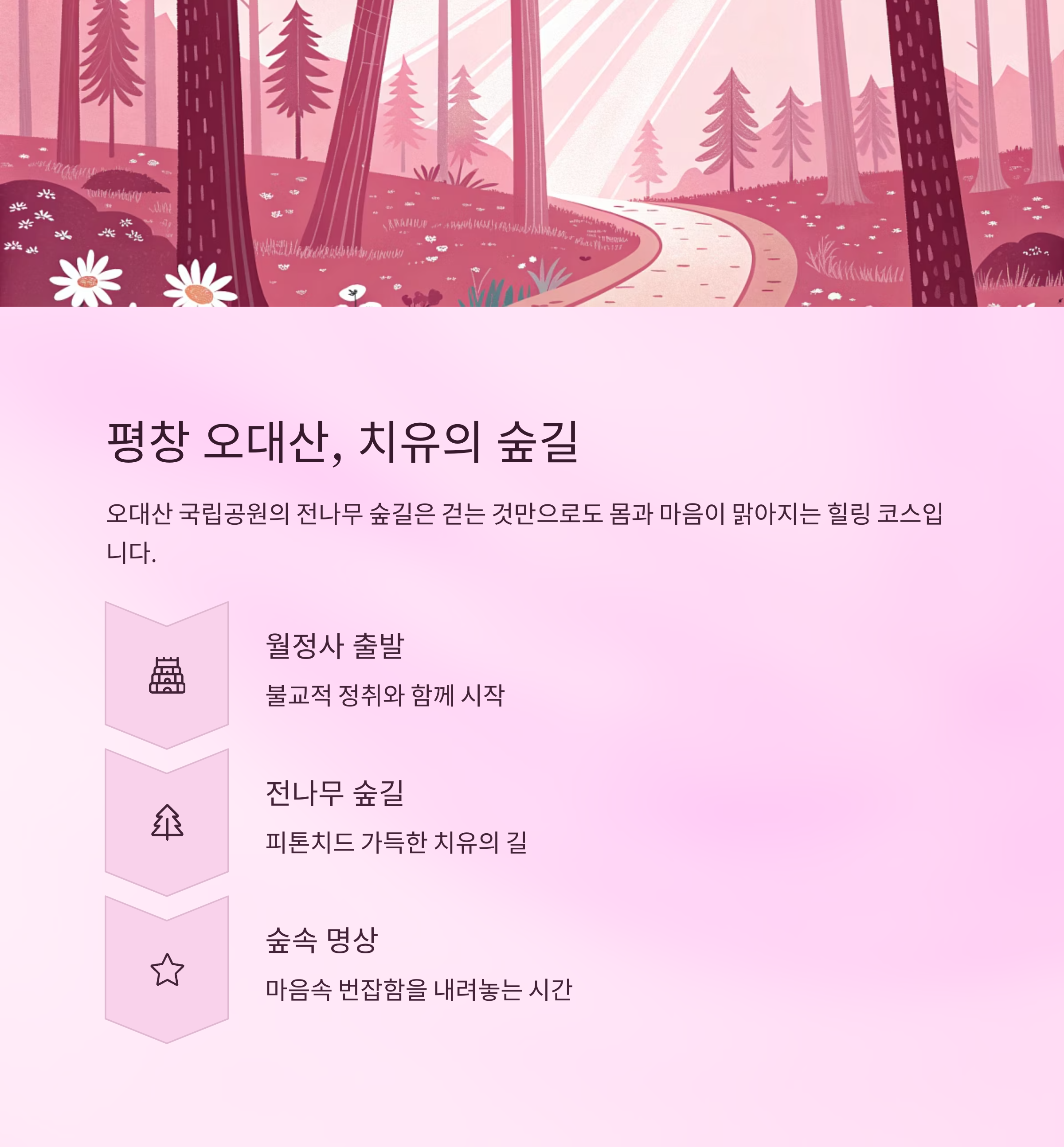 자연 속 힐링 여행지들을 다양한 스타일로 안내드립니다.
