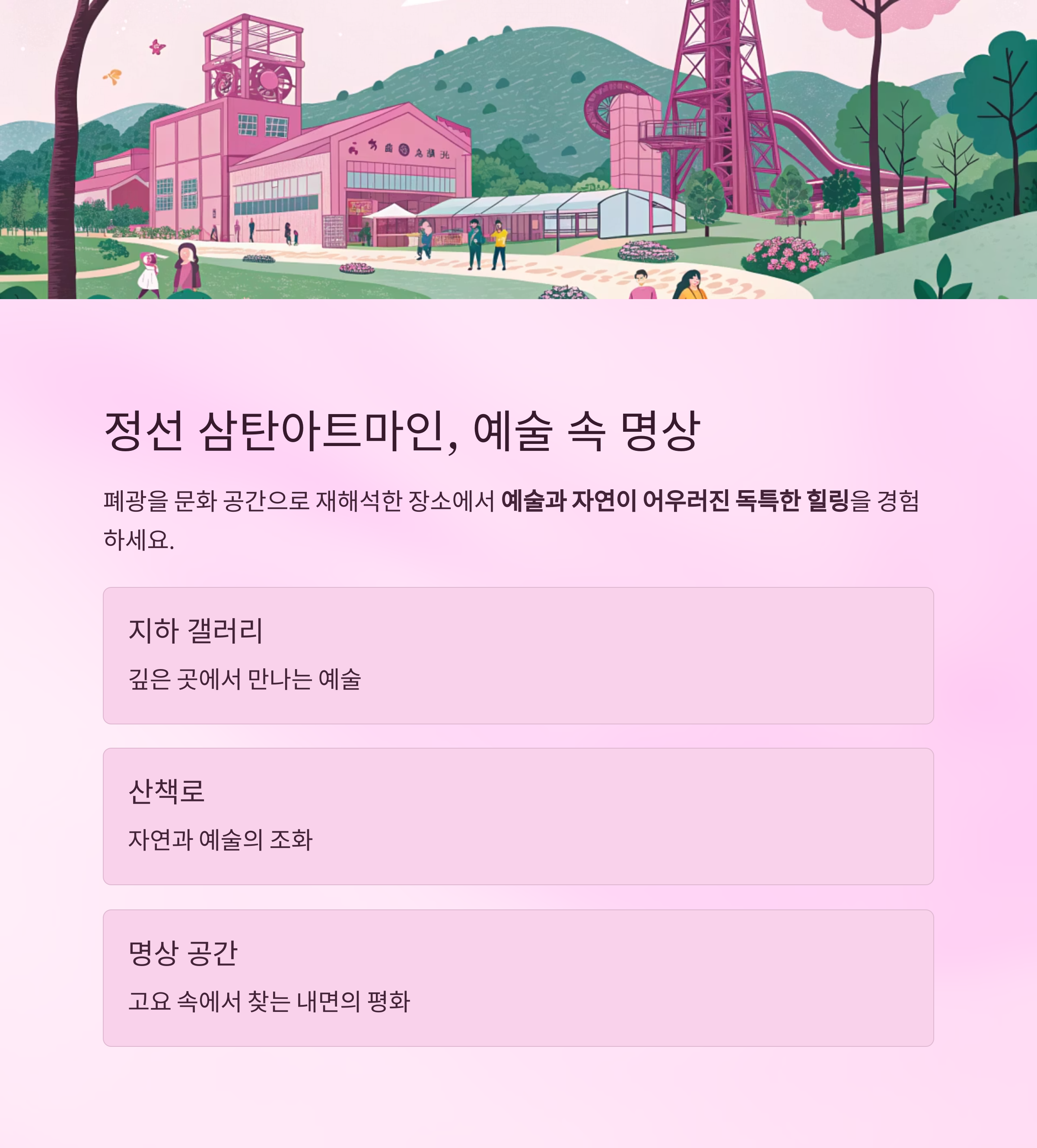 | 5 | 정선 삼탄아트마인 | 예술 명상 | 연중무휴 |