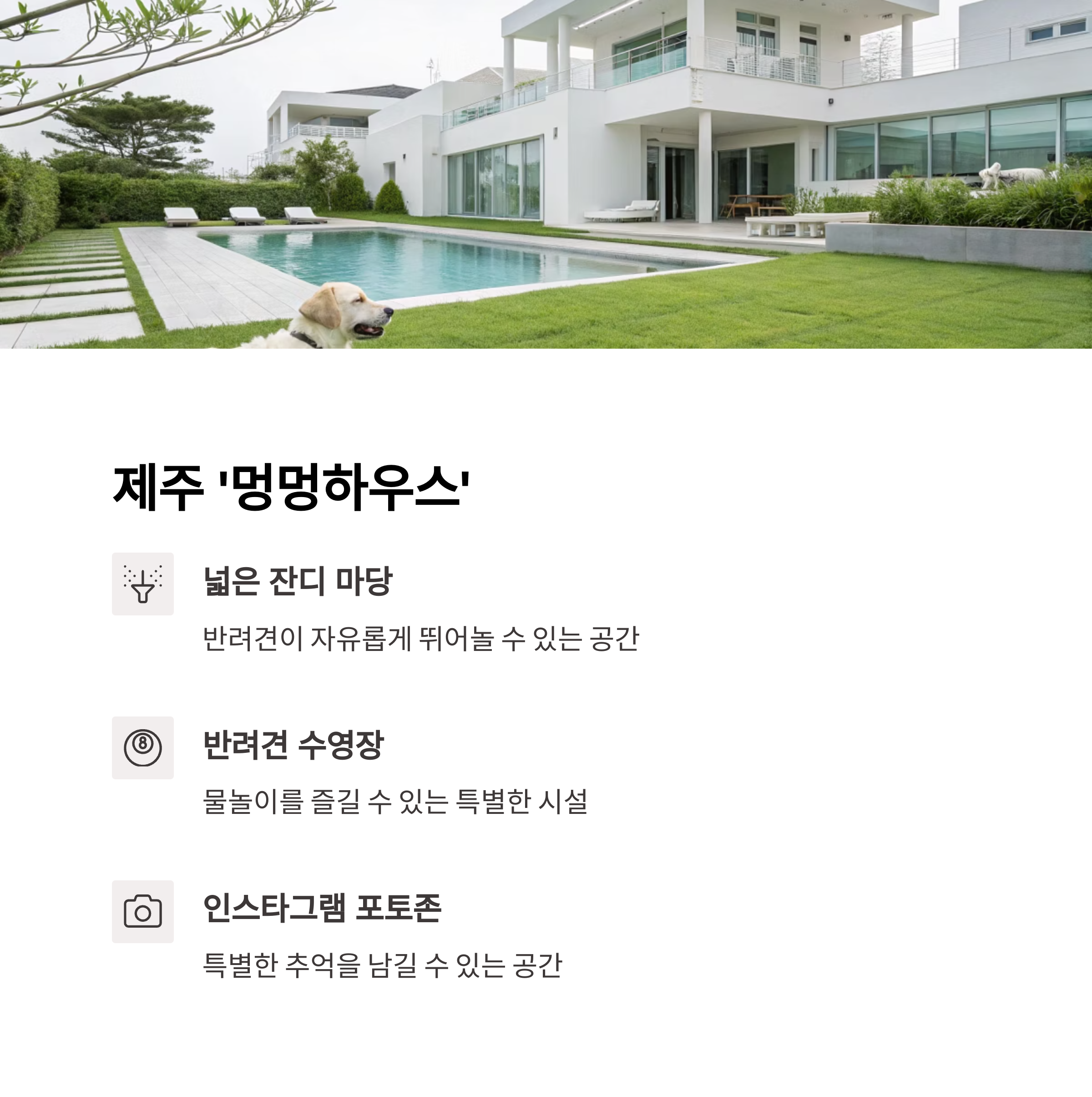 넓은 잔디 마당과 반려견 수영장, 숙소 내 포토존이 인기 포인트입니다.