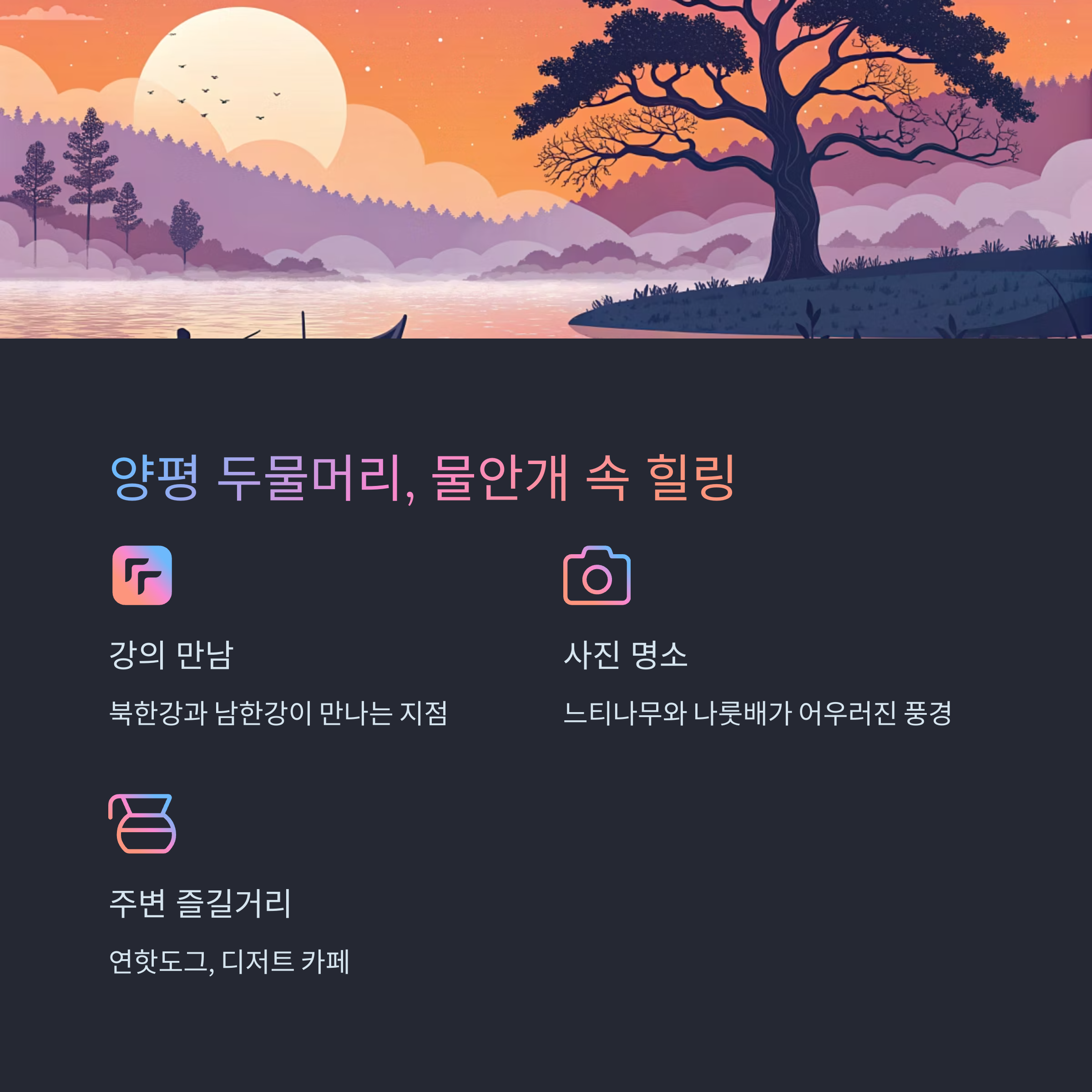 북한강과 남한강이 만나는 지점으로, 물안개와 일출로 유명한 장소입니다.