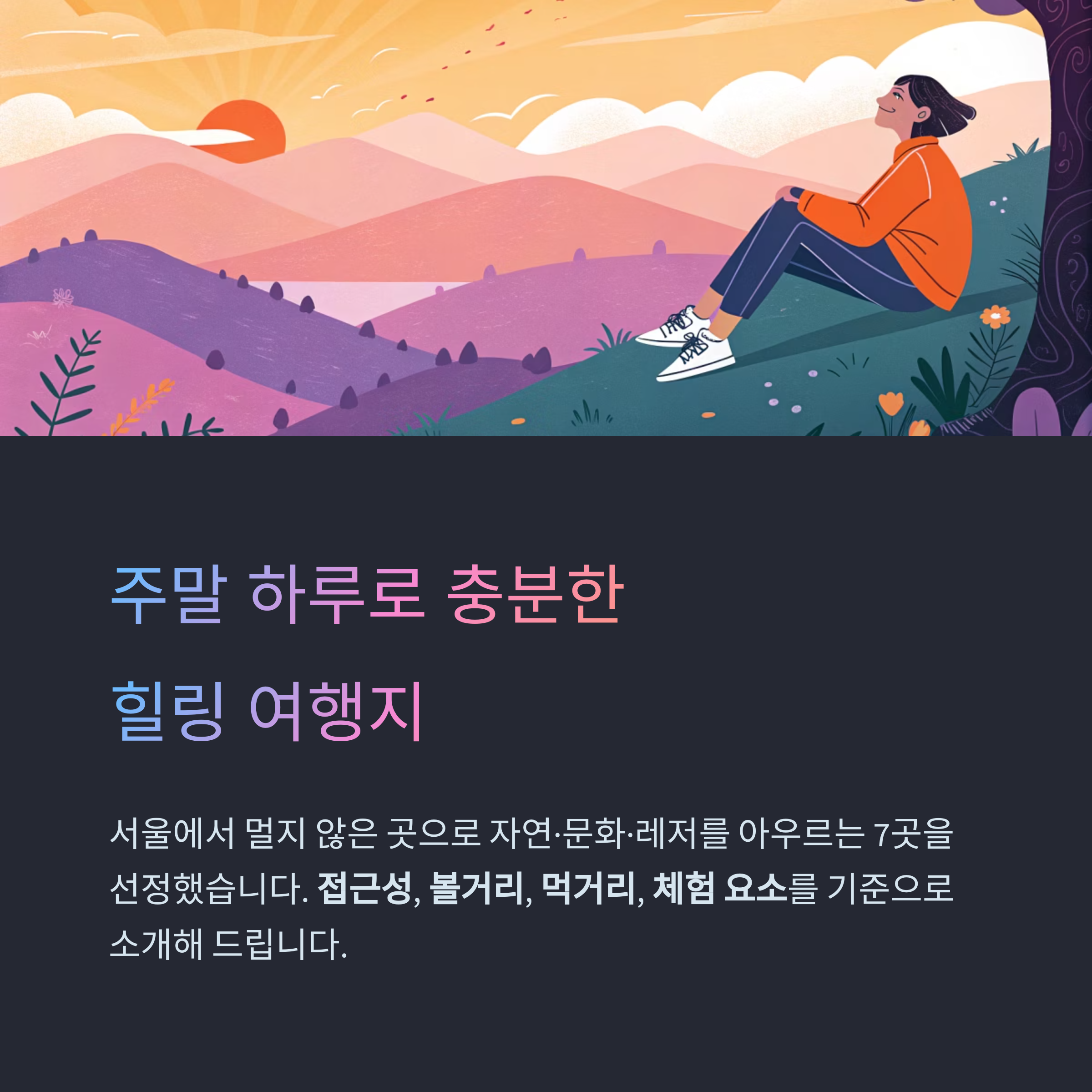 서울에서 멀지 않은 곳 중심으로 자연·문화·레저를 아우르는 7곳을 선정했습니다.