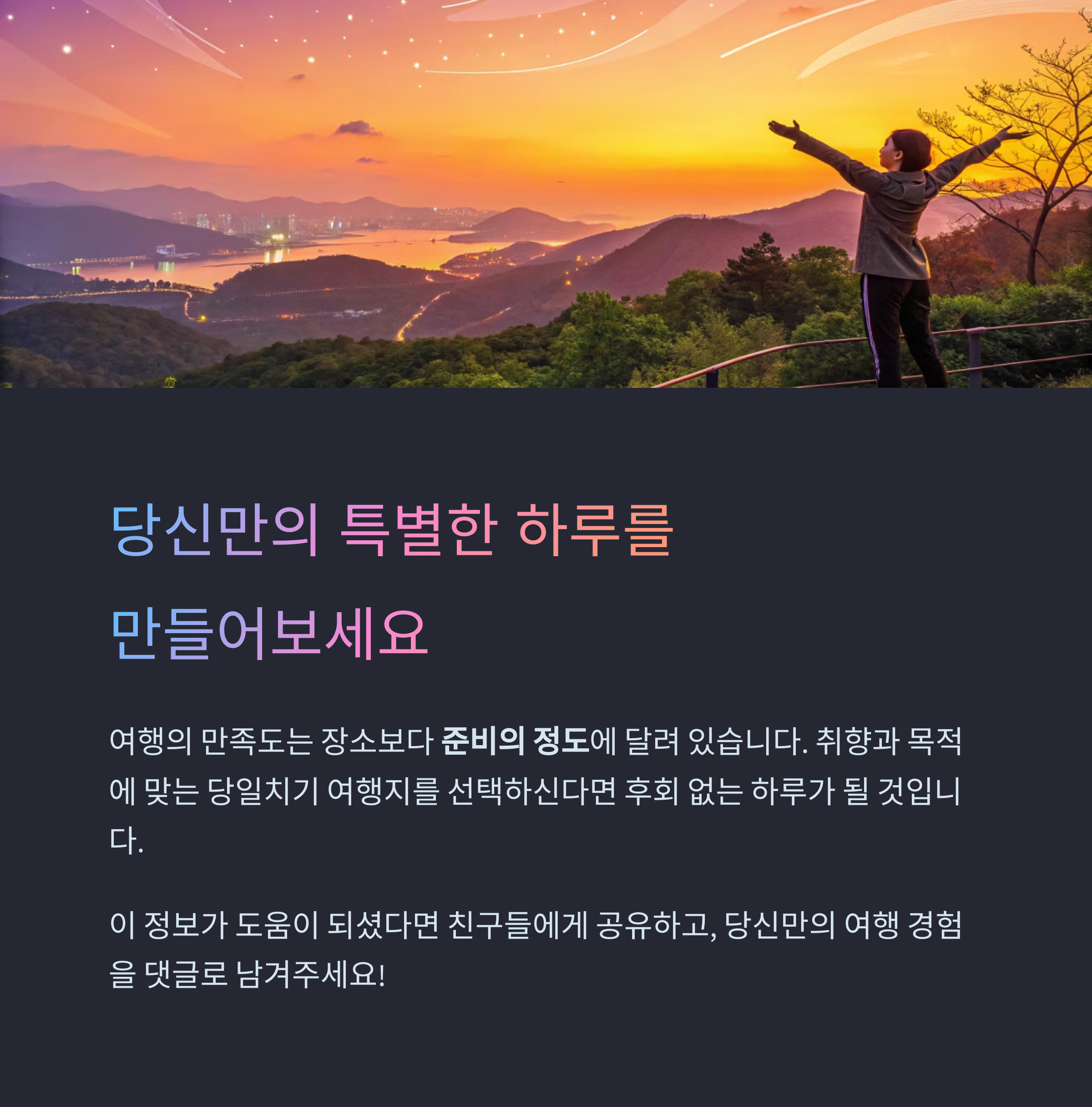 본인의 취향과 목적에 맞는 당일치기 여행지를 선택하신다면 후회 없는 하루가 될 것입니다.