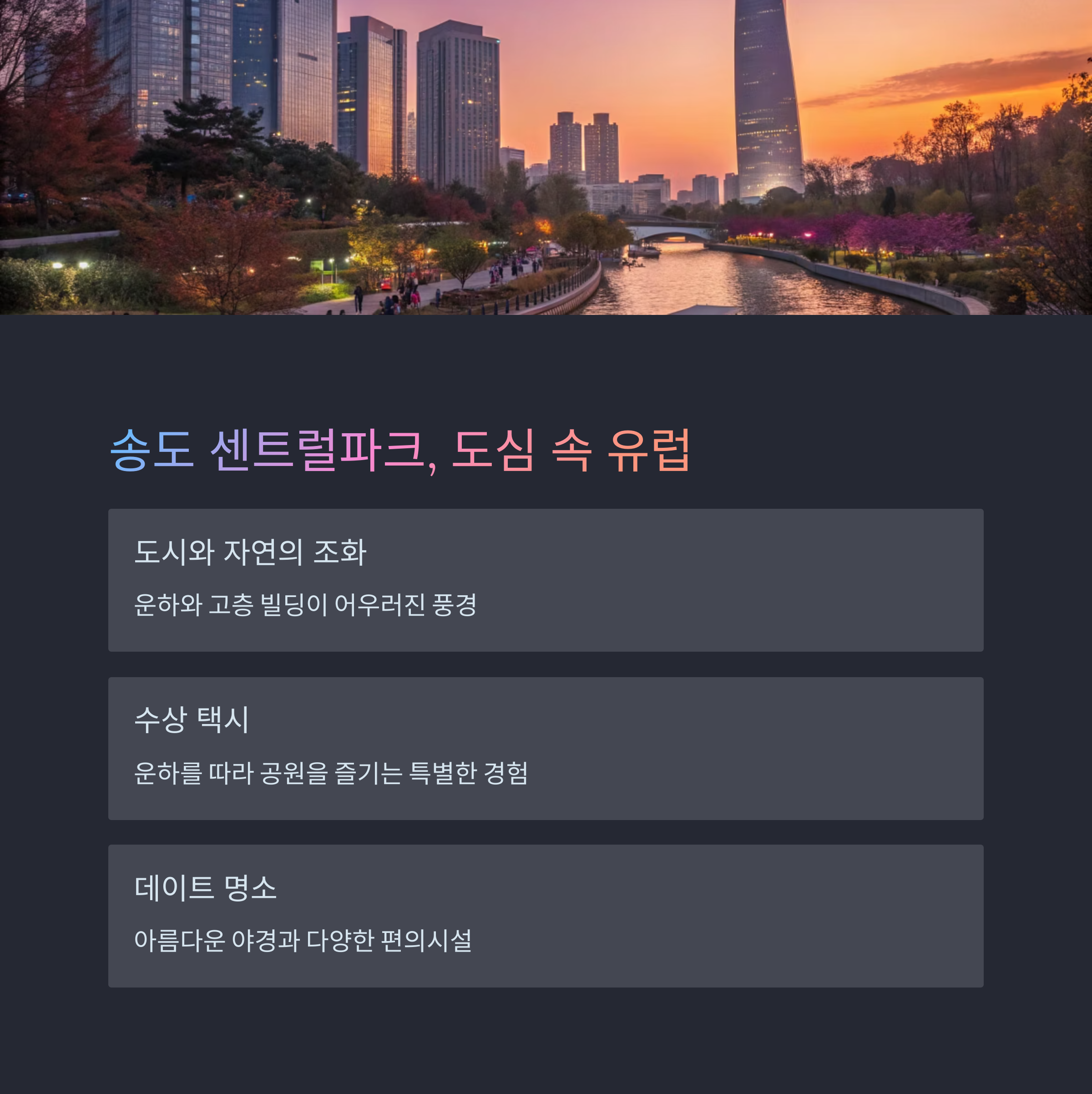 인천 송도에 위치한 이 공원은 도시와 자연이 어우러진 공간입니다.
