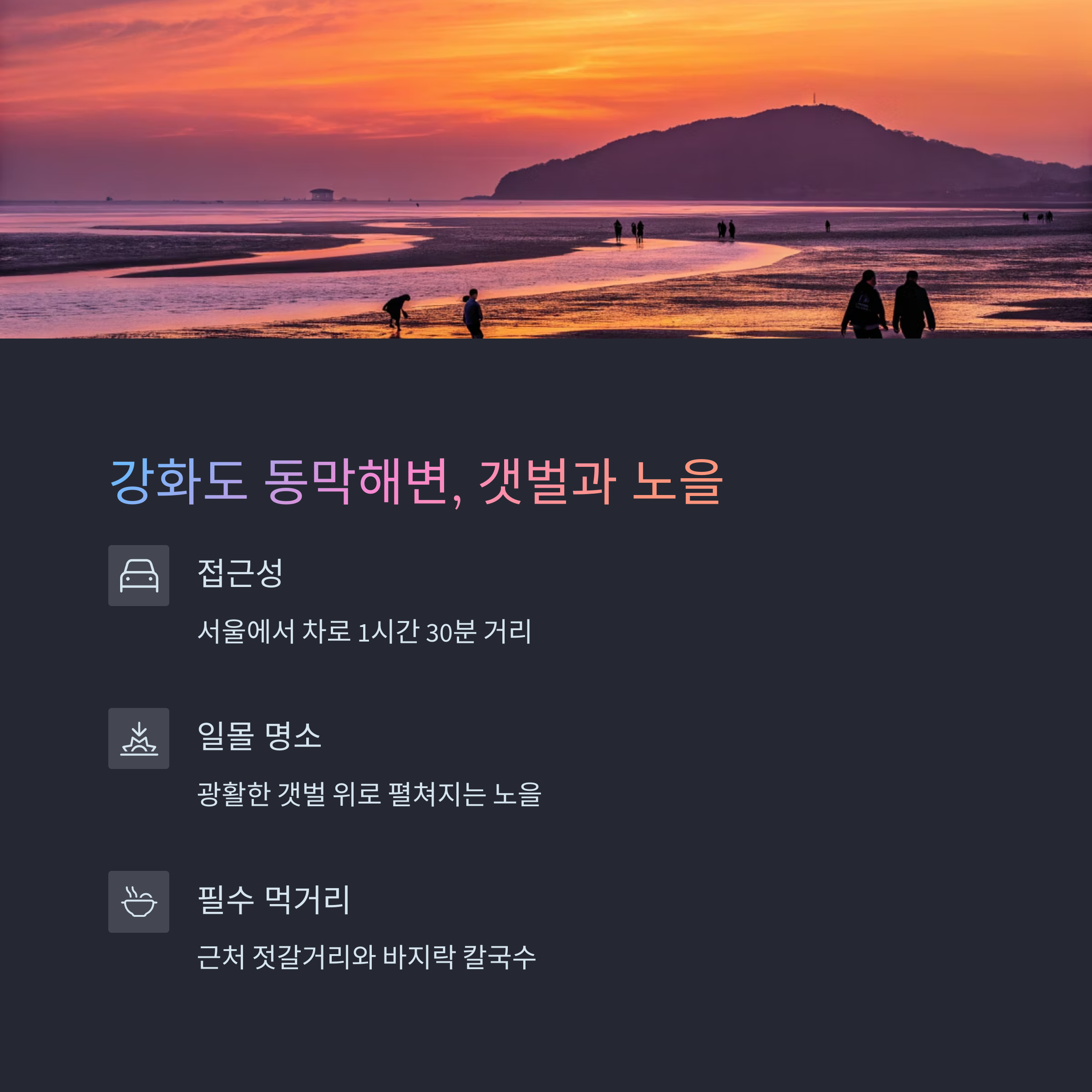 | 강화도 동막해변 | 1시간 40분 | 갯벌+노을 감상 |