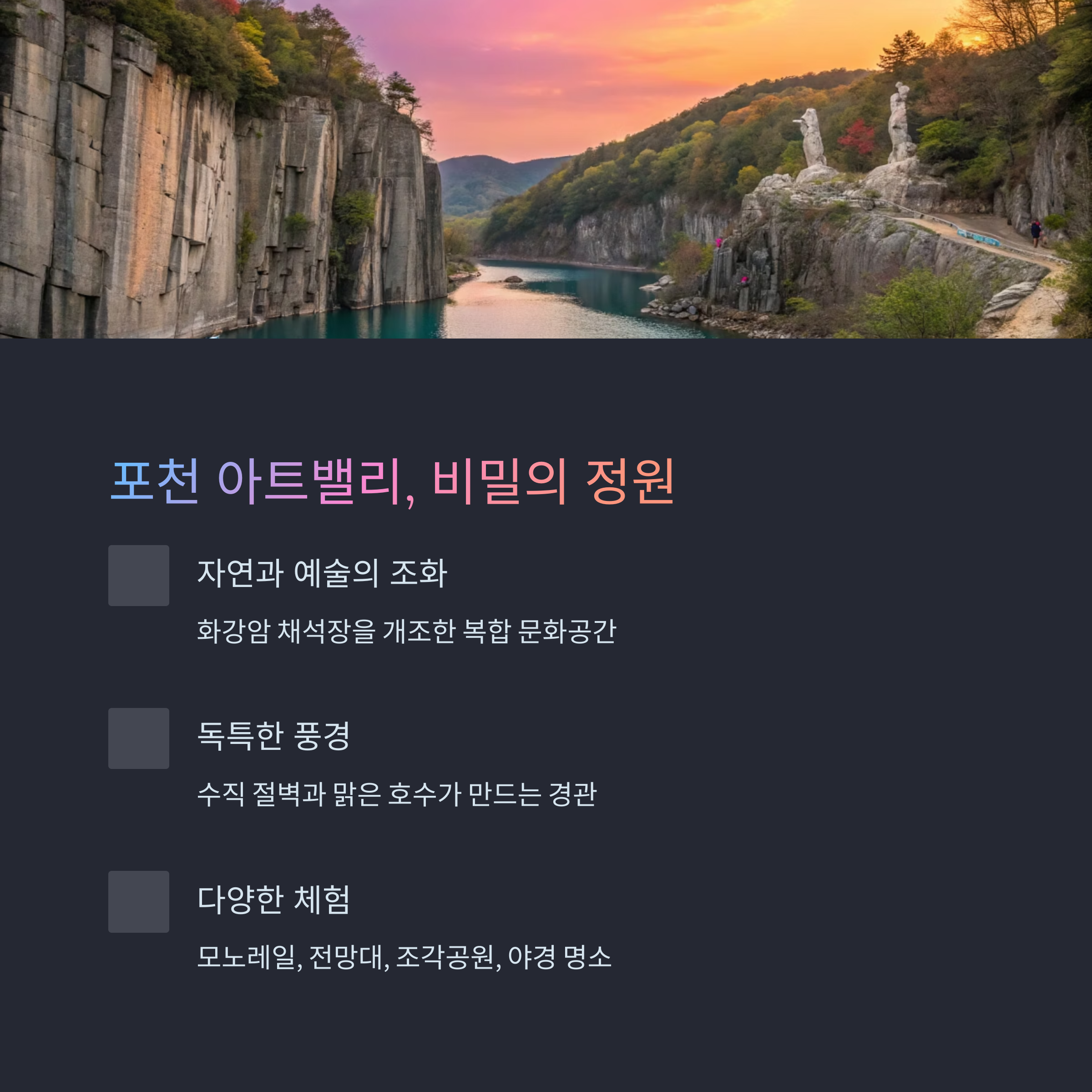 | 포천 아트밸리 | 1시간 30분 | 자연+예술 감성 |