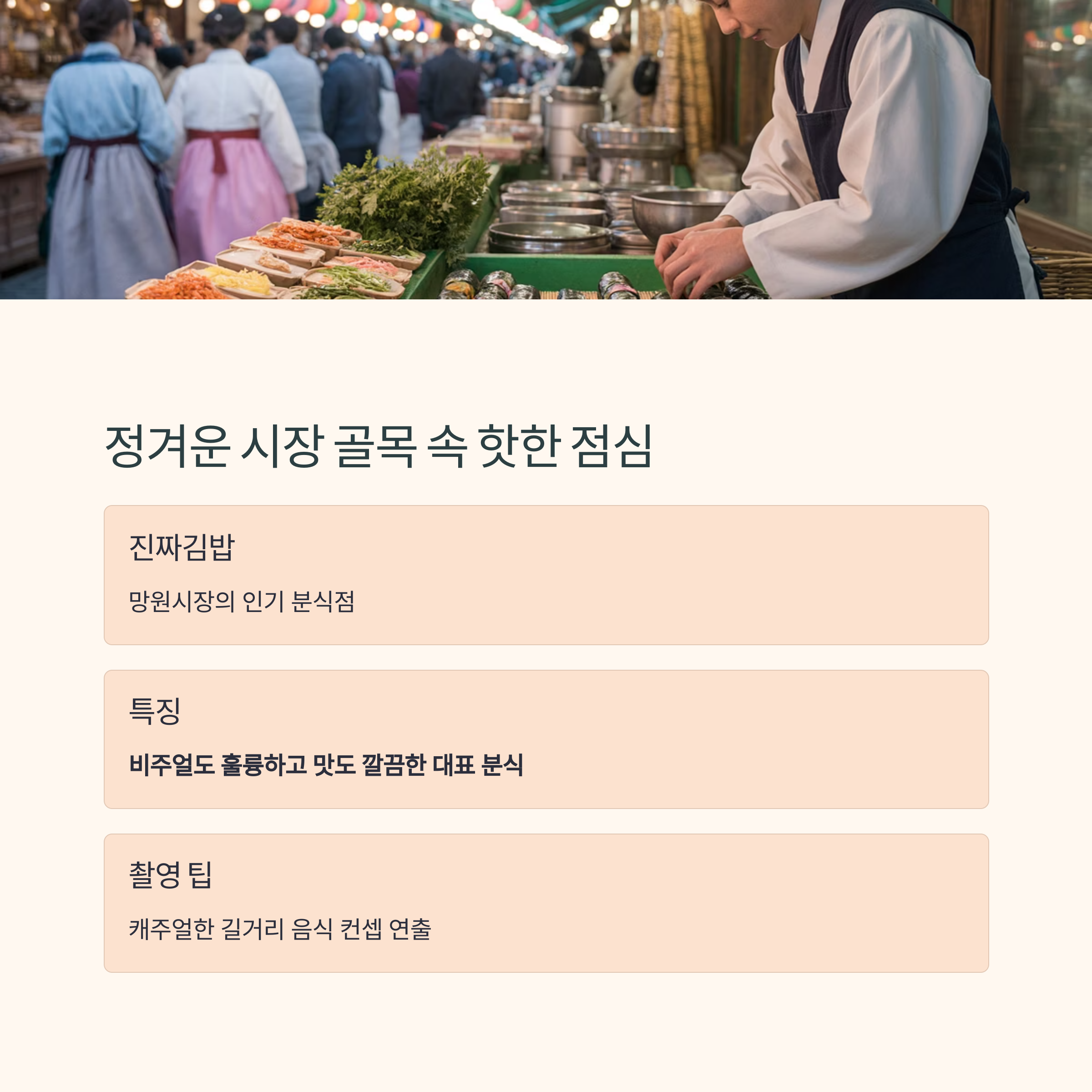 | 점심 | 진짜김밥 | 시장 속 분식, 캐주얼 분위기 |