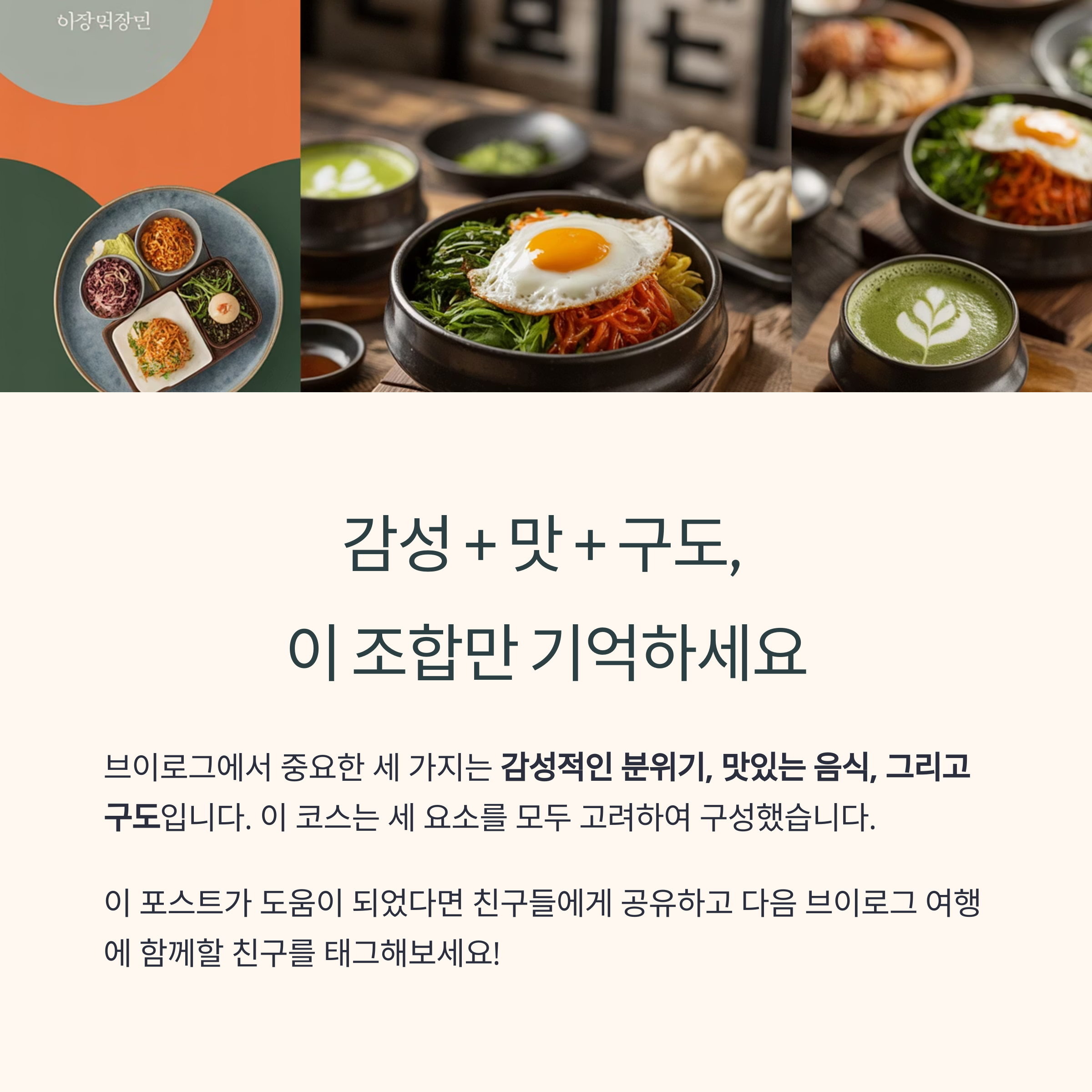브이로그에서 중요한 세 가지는 감성적인 분위기, 맛있는 음식, 그리고 구도입니다.
