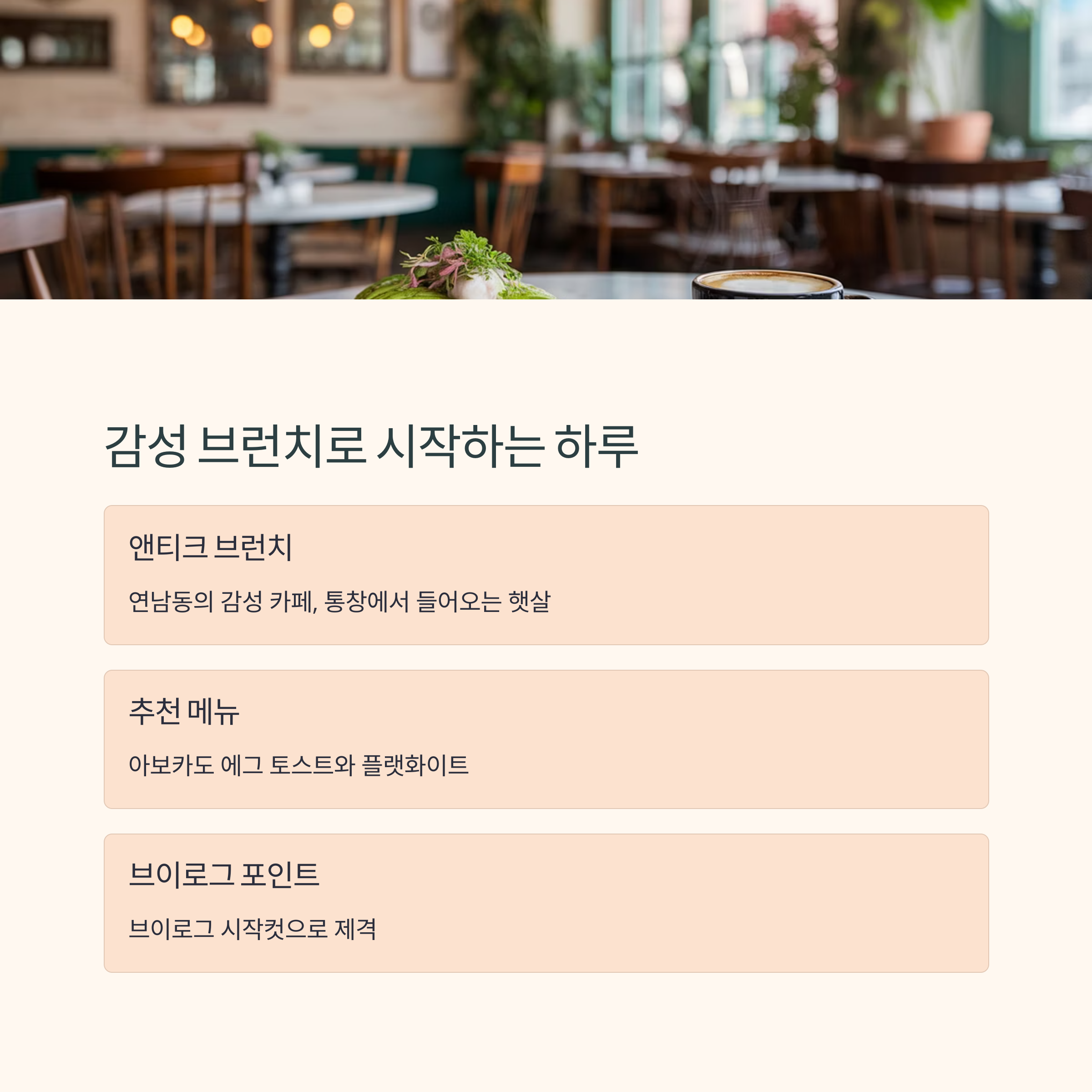 | 오전 | 앤티크 브런치 | 감성 브런치, 자연광 인테리어 |