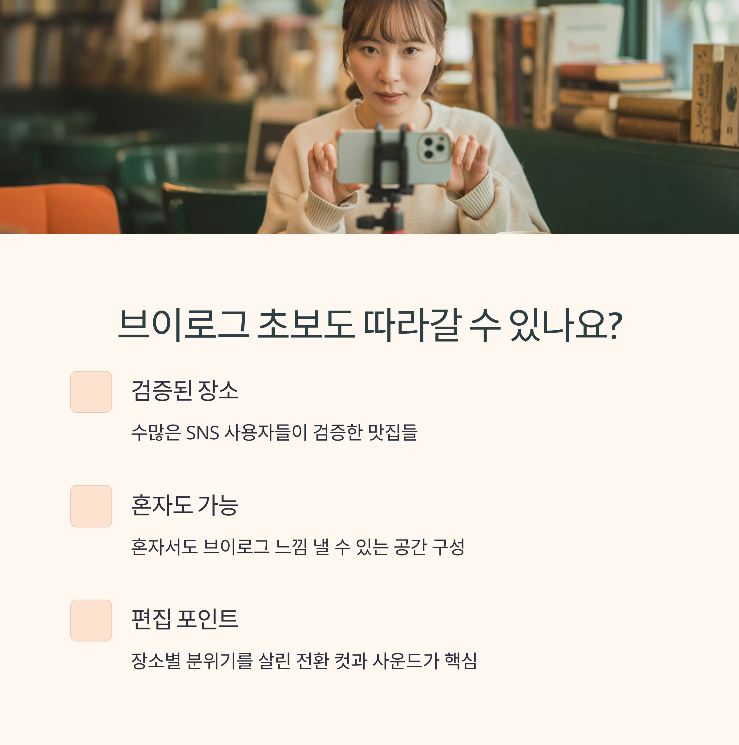"혼자서도 충분히 브이로그 느낌 낼 수 있게 공간 구성과 분위기가 탁월해요"