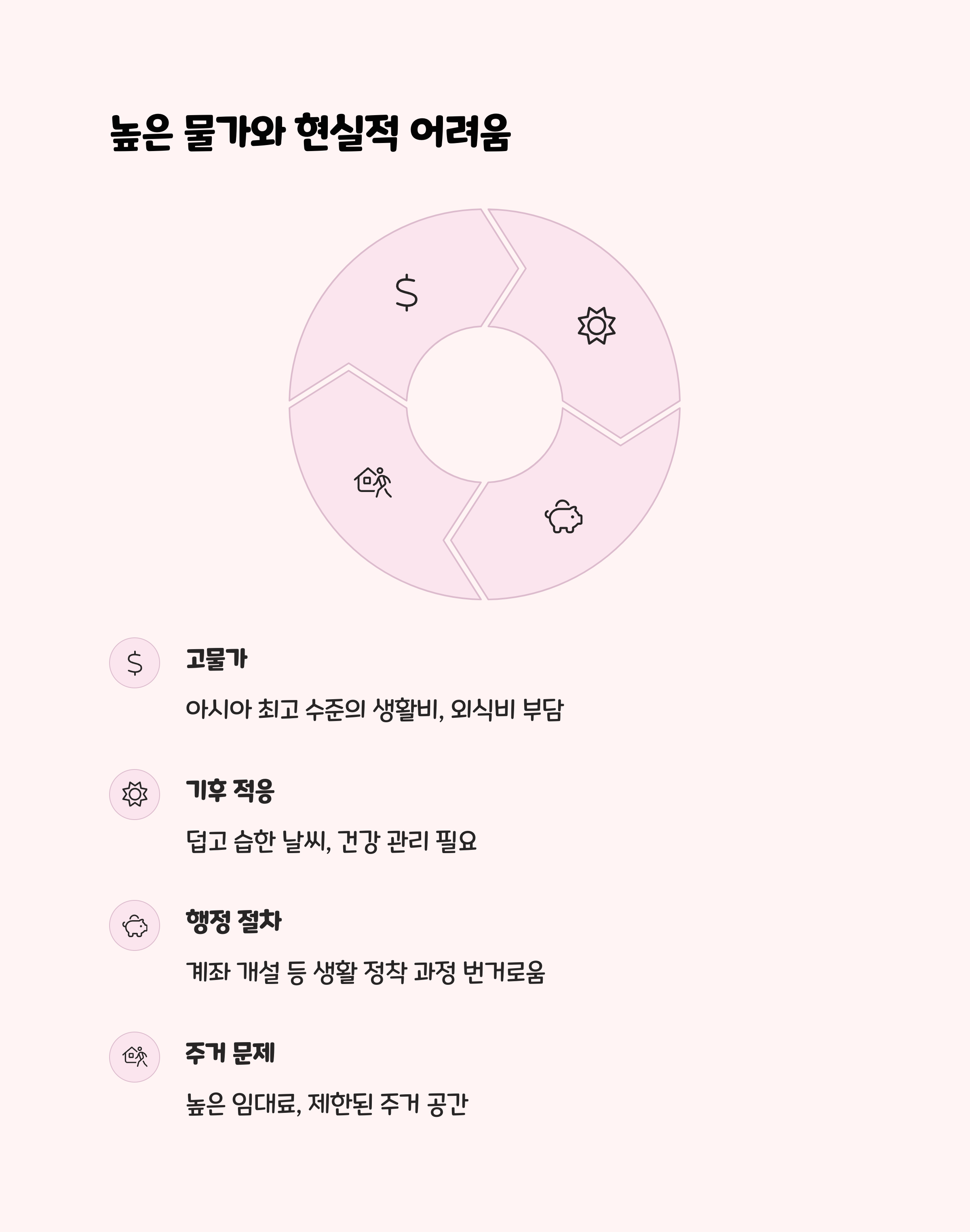 | 주거비, 식비, 교통비 정보 | 다국적 기업의 분위기 | 규칙 중심의 도시문화 체험 |