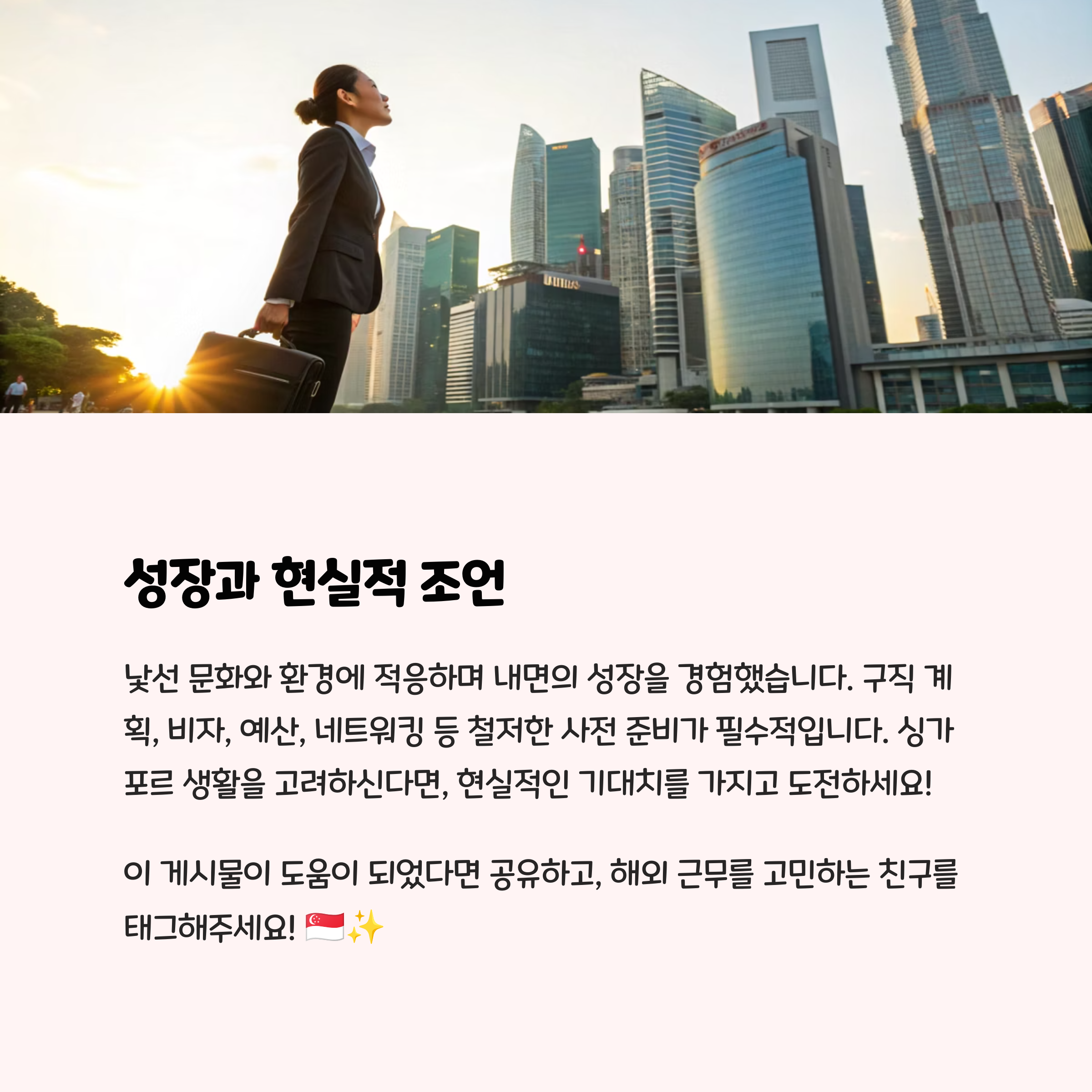 싱가포르에서의 3개월은 한마디로 '짧지만 강렬한 성장의 시간'이었습니다. 새로운 환경에서 일하고 살아가는 동안 낯선 문화 속에서 나를 이해하고 사람들과 소통하는 법을 배웠습니다. 이 글을 통해 누군가의 첫 해외 체류에 용기와 현실적인 도움을 줄 수 있기를 바랍니다. 누구든 도전할 수 있습니다. 단 한 걸음이 인생을 바꾸는 출발점이 되니까요.