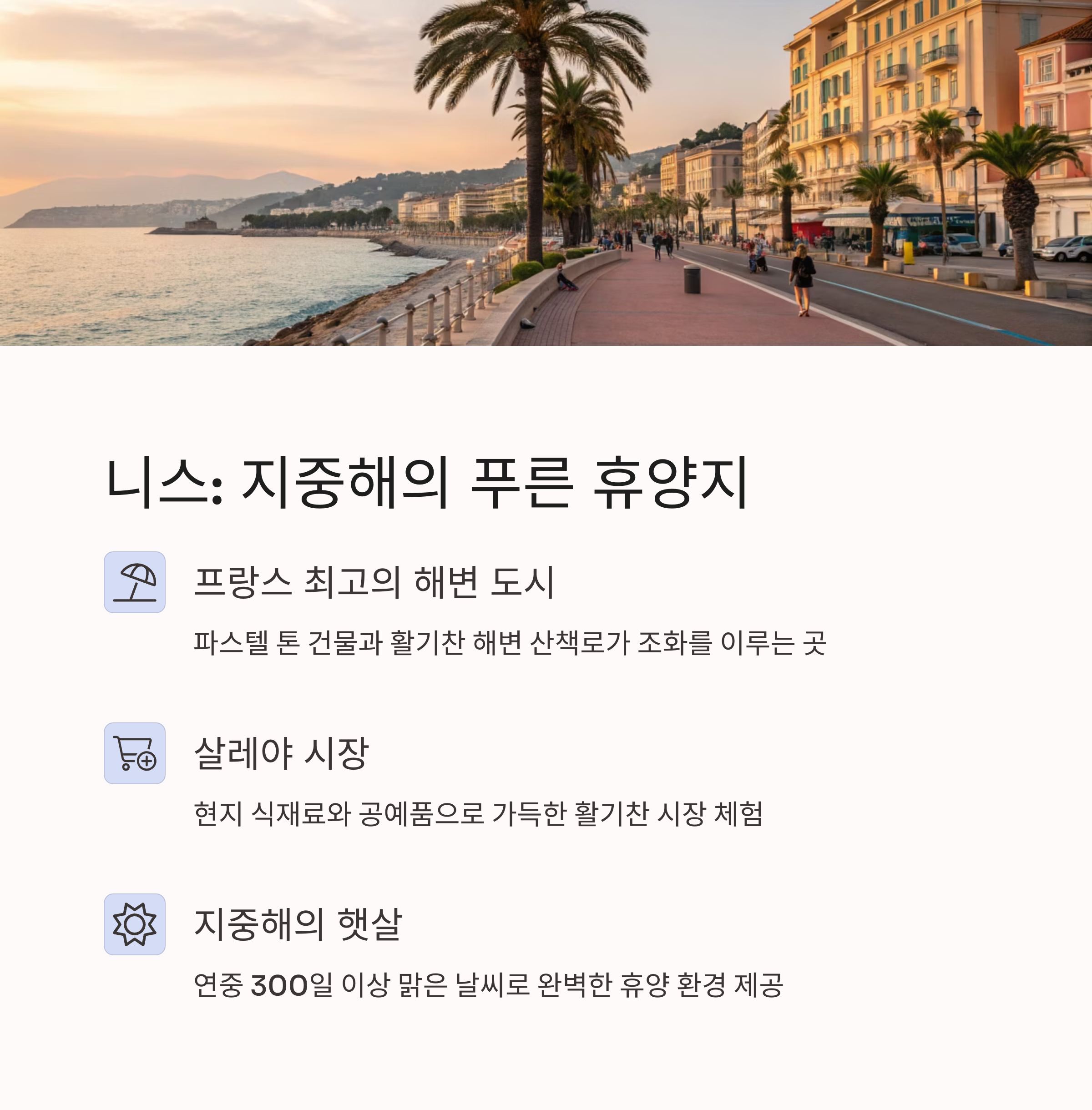프랑스 남부는 감성적인 풍경이 끊임없이 펼쳐지는 유럽 속의 작은 낙원입니다. 특히 니스에서는 코발트빛 지중해와 형형색색의 건물들이 마치 동화 속 장면처럼 여행자의 시선을 사로잡습니다. 해안선을 따라 이어지는 산책로, 파스텔톤 카페거리, 그리고 시끌벅적한 시장 풍경까지, 모든 곳이 인생샷 명소입니다. 여행을 하며 가장 많이 들었던 말은 “여기 진짜 인스타 감성 그 자체다”였습니다. 사진 한 장마다 이야기가 담기고, 걷는 순간순간이 추억이 되는 곳. 그것이 바로 프랑스 남부의 매력입니다.