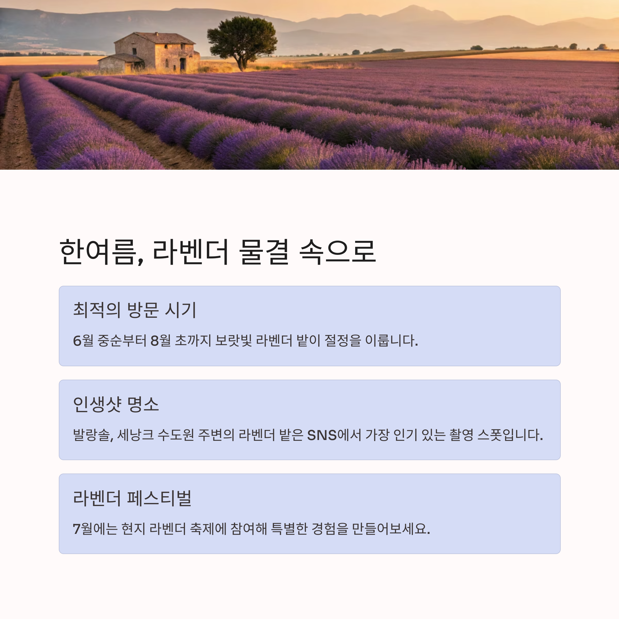 | 라벤더 시즌 6~7월 | 감성 숙소에서 여유 즐기기 | 그림 같은 마을 산책 |