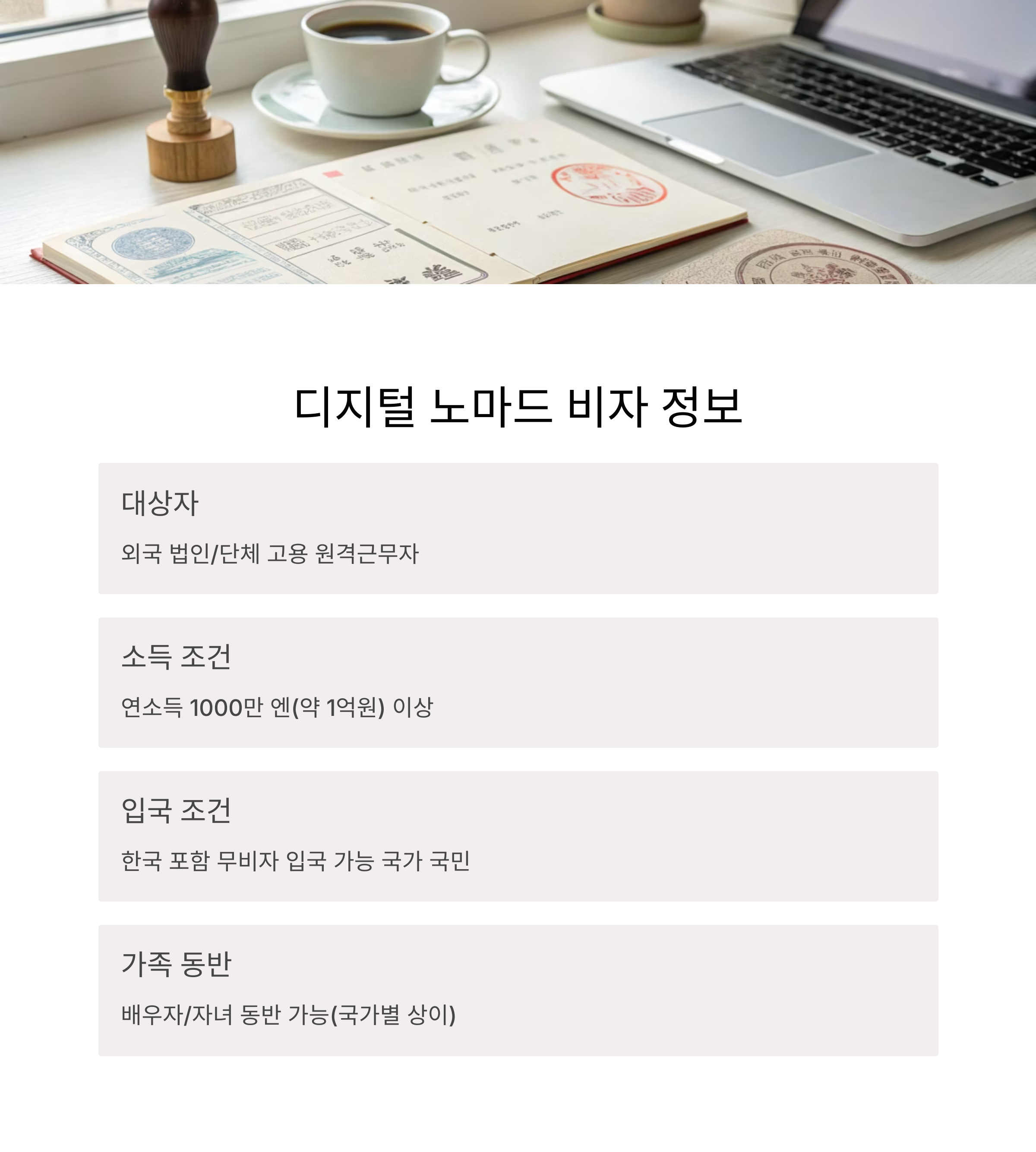 현재까지 일본은 공식적인 디지털 노마드 비자는 없지만 단기 비자(90일 무비자 체류) 또는 워킹홀리데이 비자를 활용한 체류가 일반적입니다.