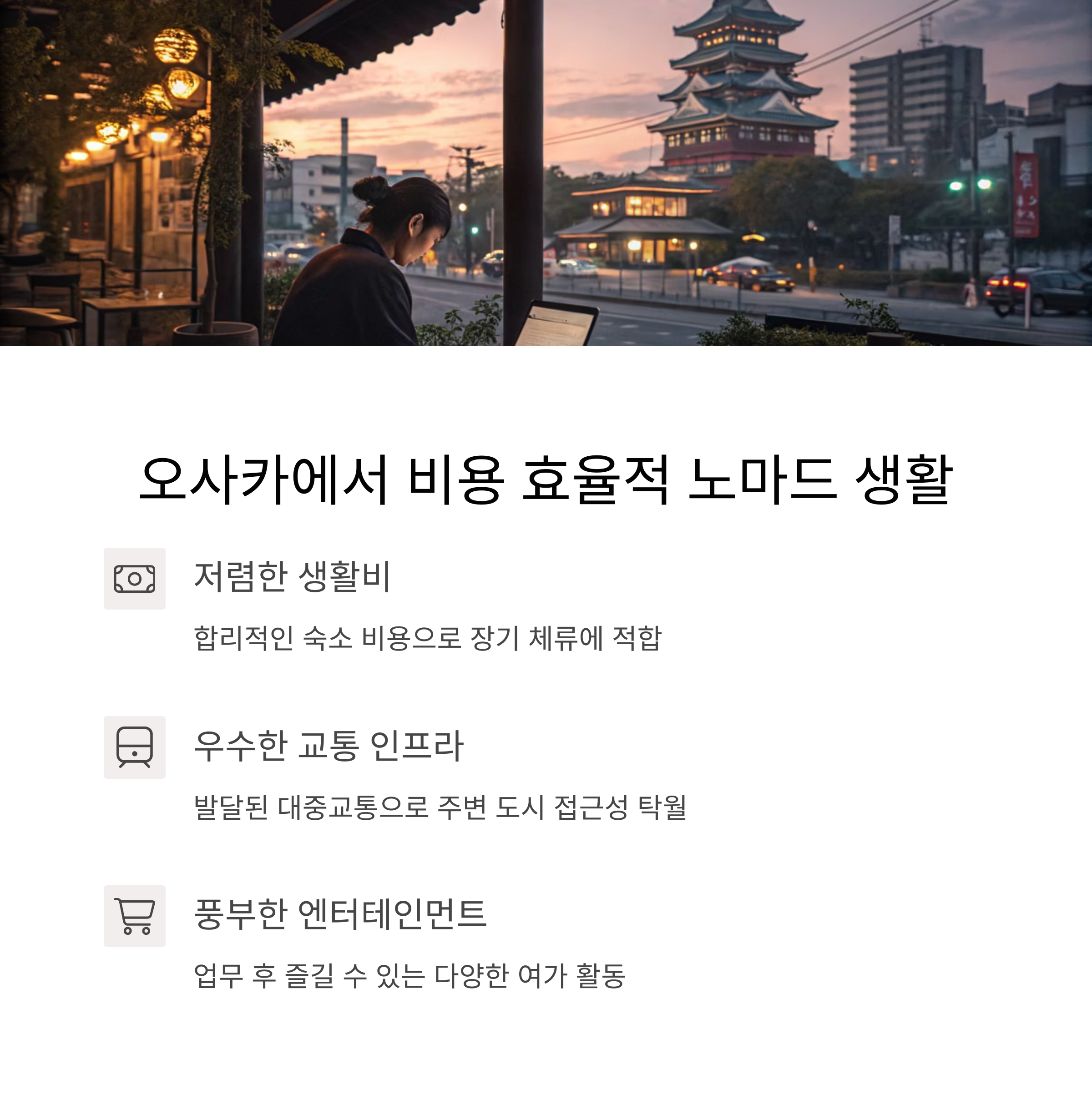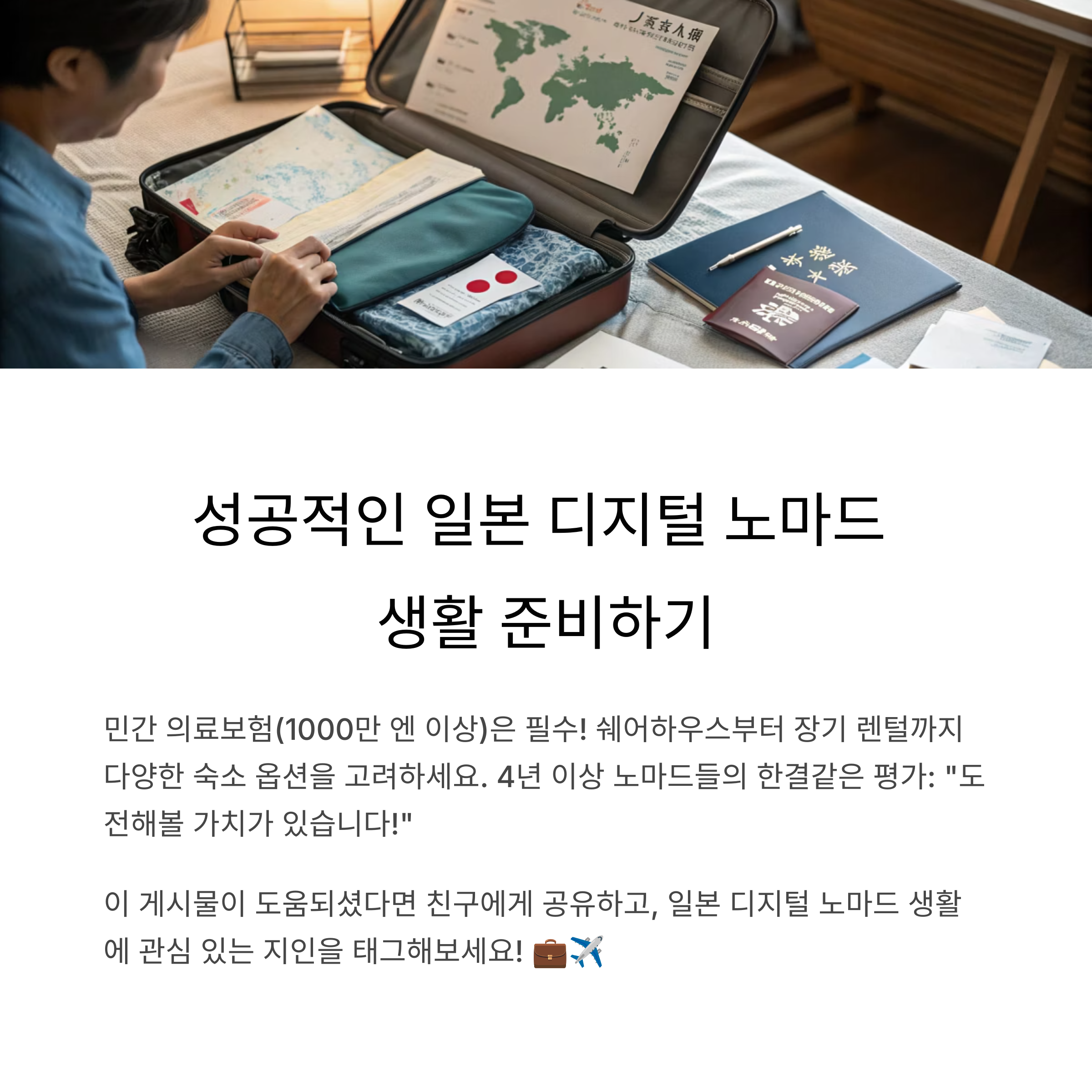 일본은 디지털 노마드에게 안정적이면서도 문화적인 만족감을 주는 나라입니다. 도쿄 외에도 다양한 도시에서 충분한 여건과 여유를 갖춘 삶을 경험할 수 있으며, 자신에게 맞는 도시를 선택한다면 일과 여행의 밸런스를 완벽하게 누릴 수 있습니다. 이 글이 일본에서 노마드 생활을 시작하려는 분들께 실질적인 도움이 되길 바랍니다.