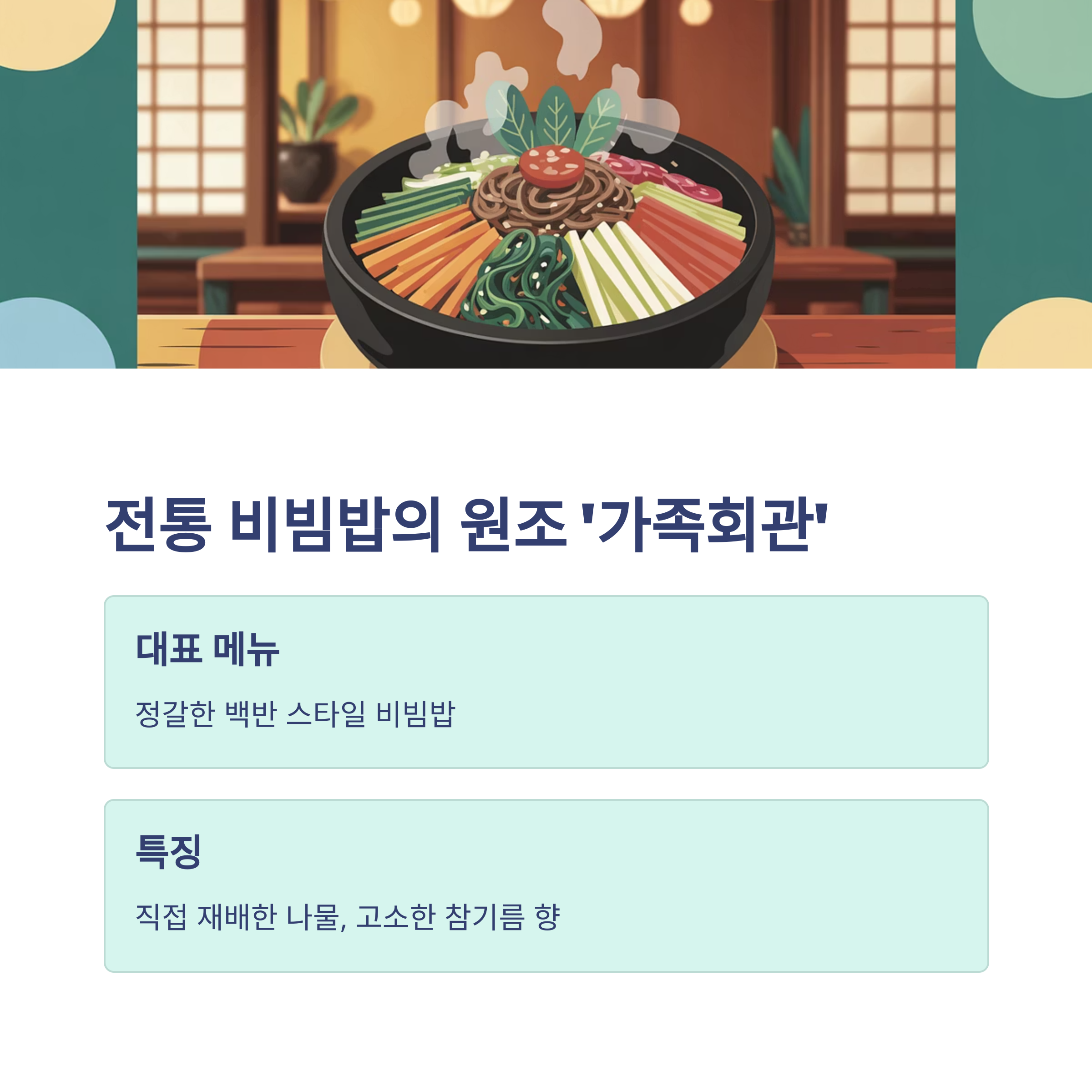 | 전통한식 | 가족회관 | 비빔밥 | 원조격, 깊은 맛 |