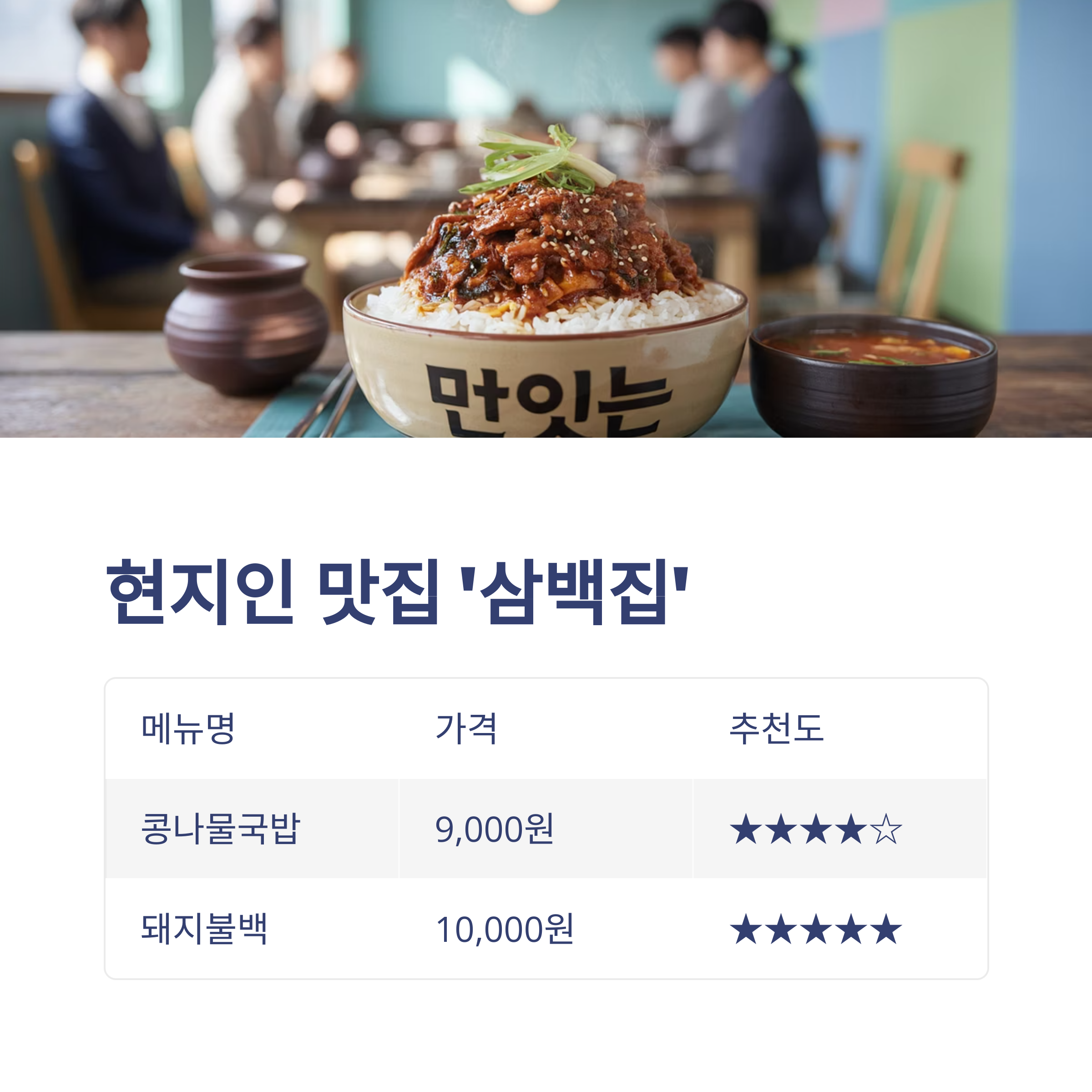| 콩나물국밥 | 9,000원 | ★★★★☆ |