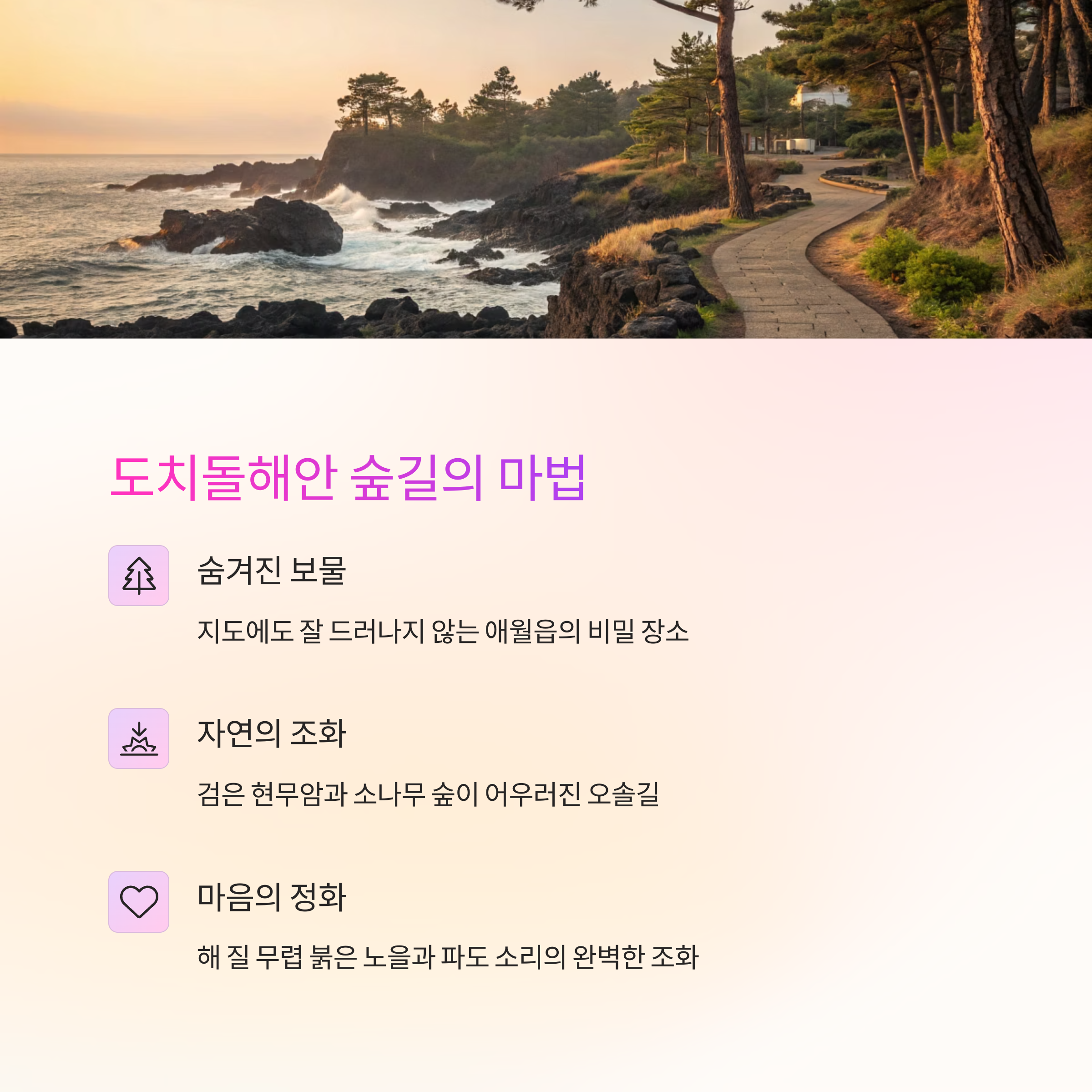 | 도치돌해안숲길 | 애월 | 숲과 바다 산책로, 노을 |