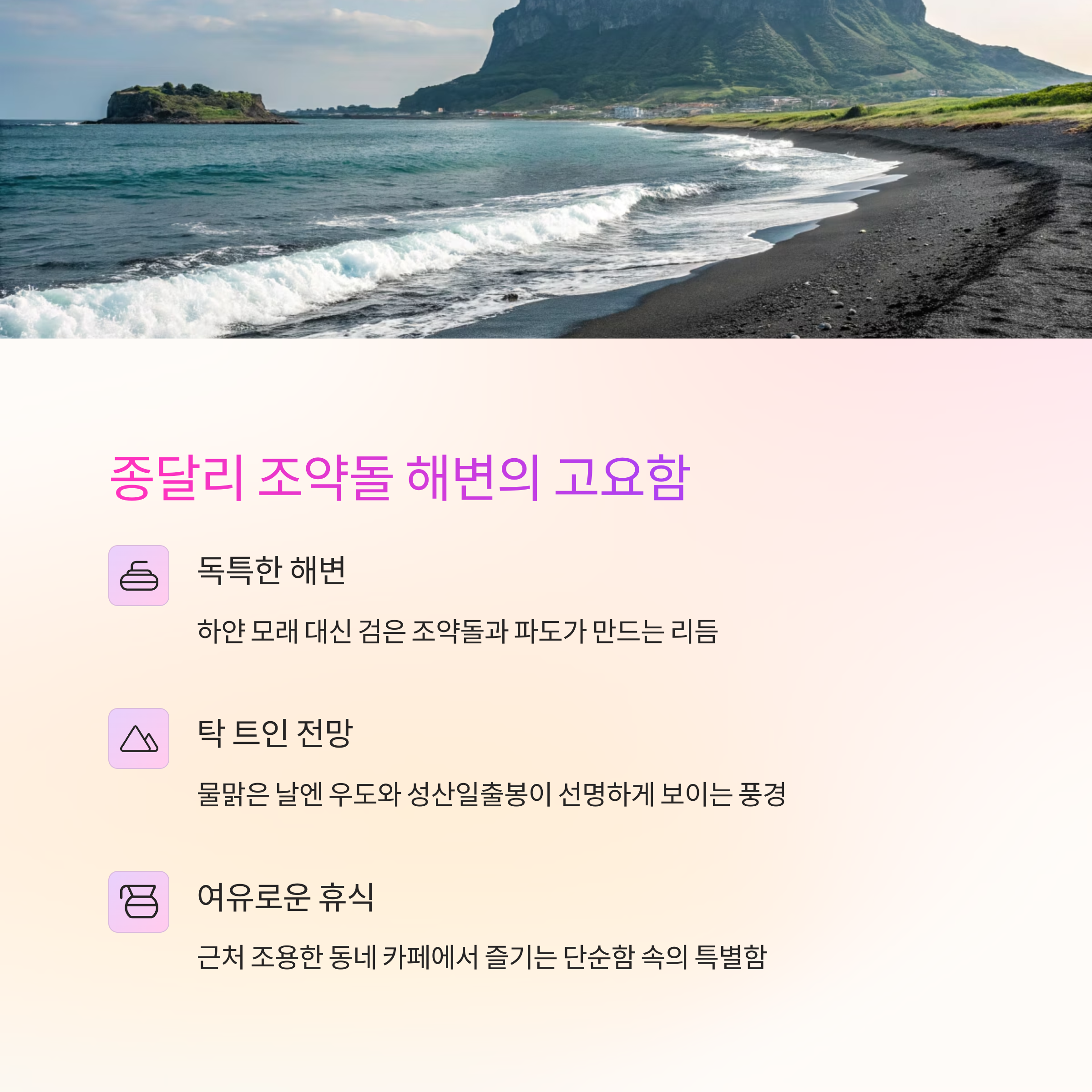 | 종달리해변 | 조천 | 조약돌 해변, 고요한 풍경 |