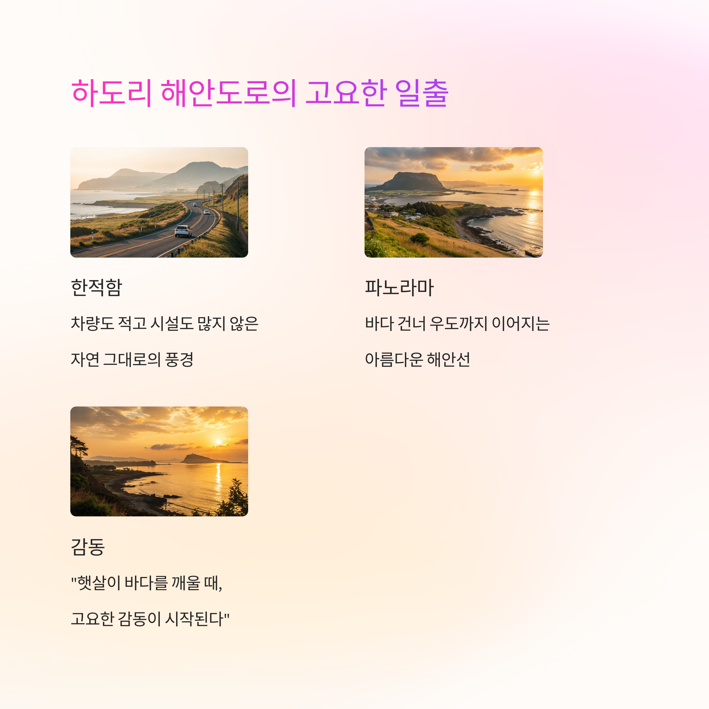 성산일출봉보다 더 조용하고 감성적인 일출을 보고 싶다면 하도리 해안도로를 추천합니다.