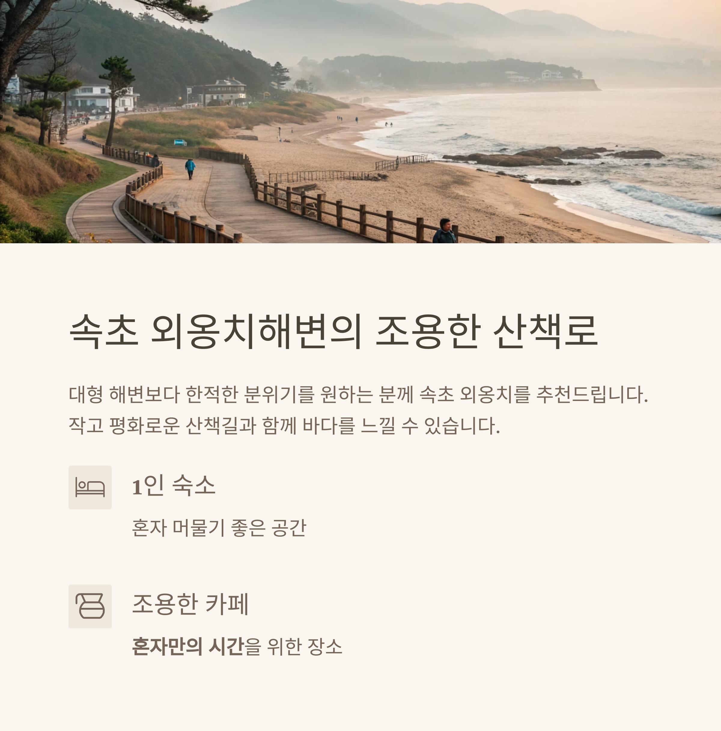 | 속초 외옹치 | 소형 해변 | 산책과 숙소 밀집 |
