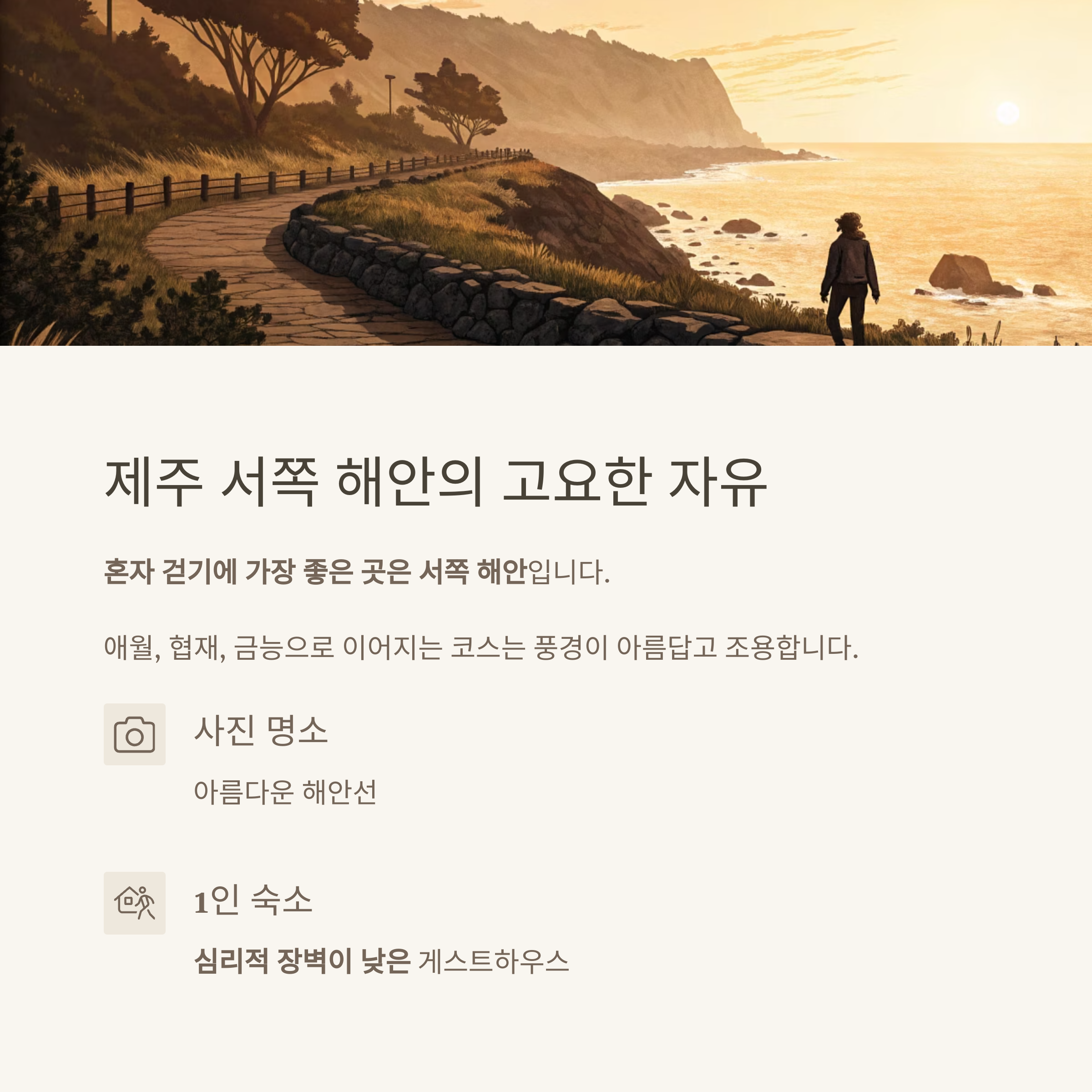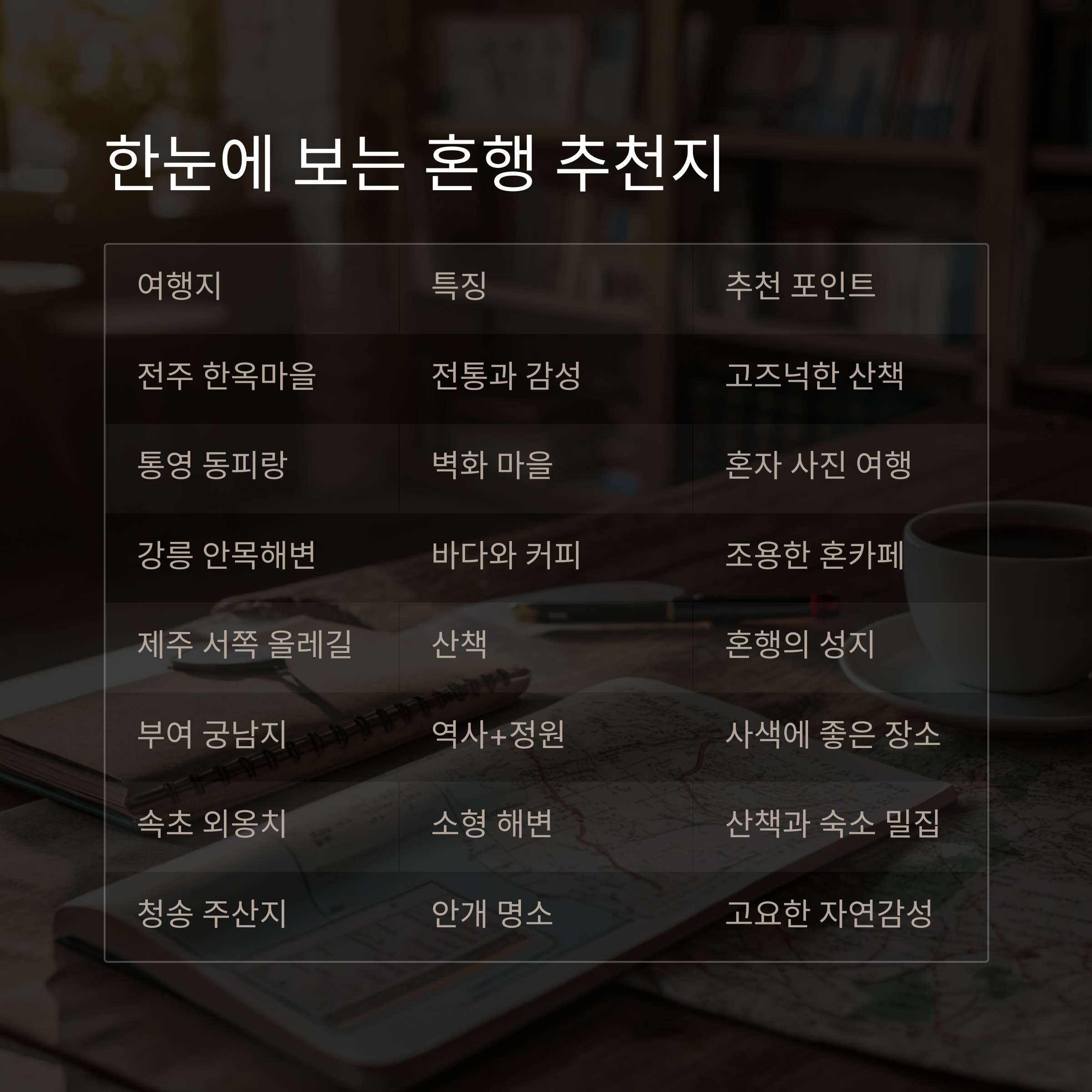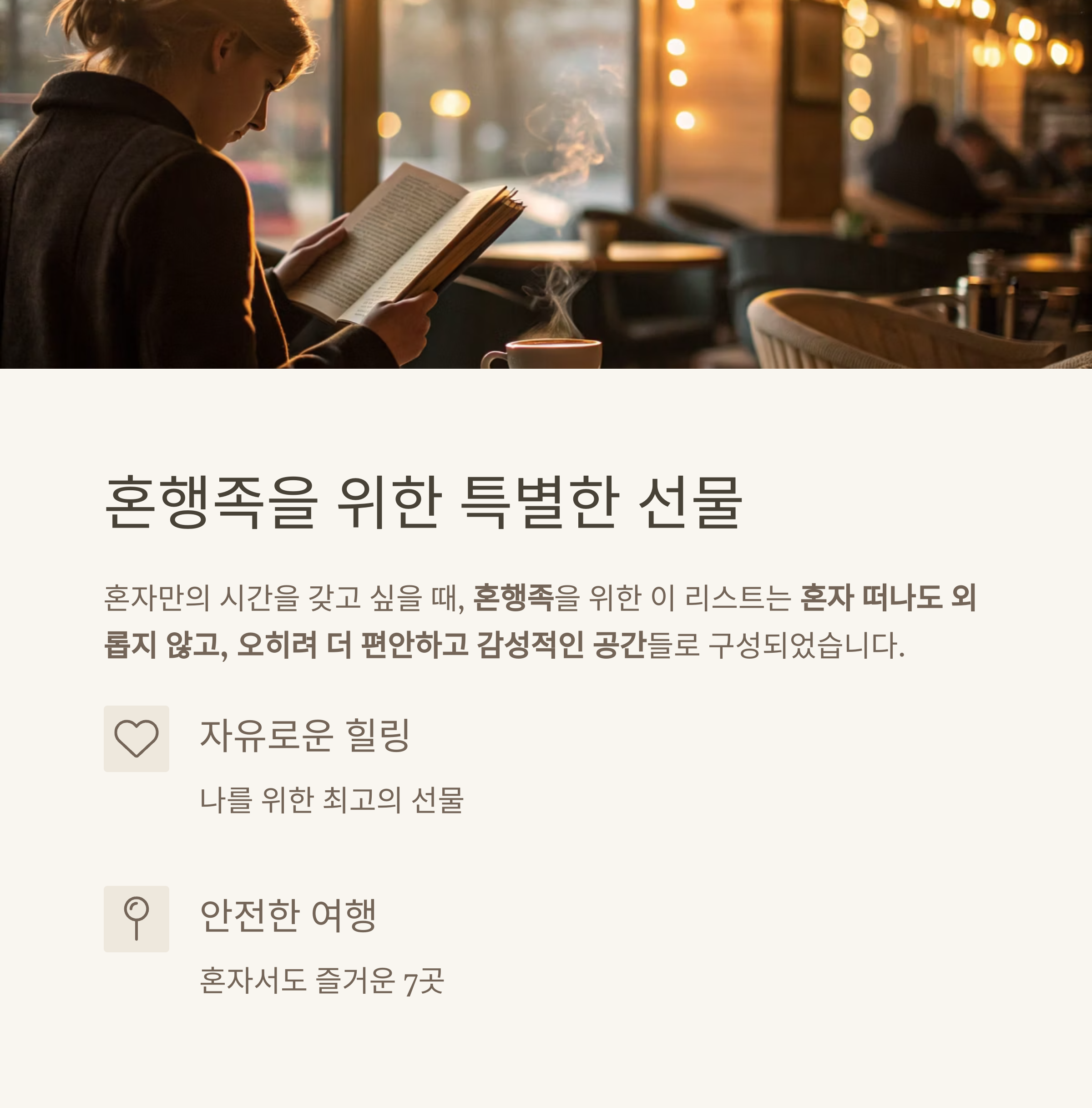혼행족을 위한 이 리스트는 혼자 떠나도 외롭지 않고, 오히려 더 편안하고 감성적인 공간들로 구성되었습니다.