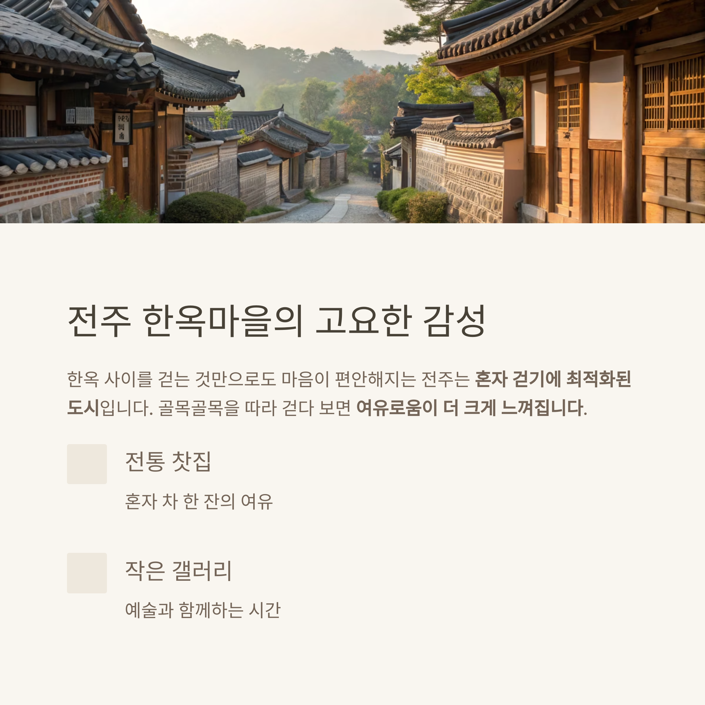 | 전주 한옥마을 | 전통과 감성 | 고즈넉한 산책 |