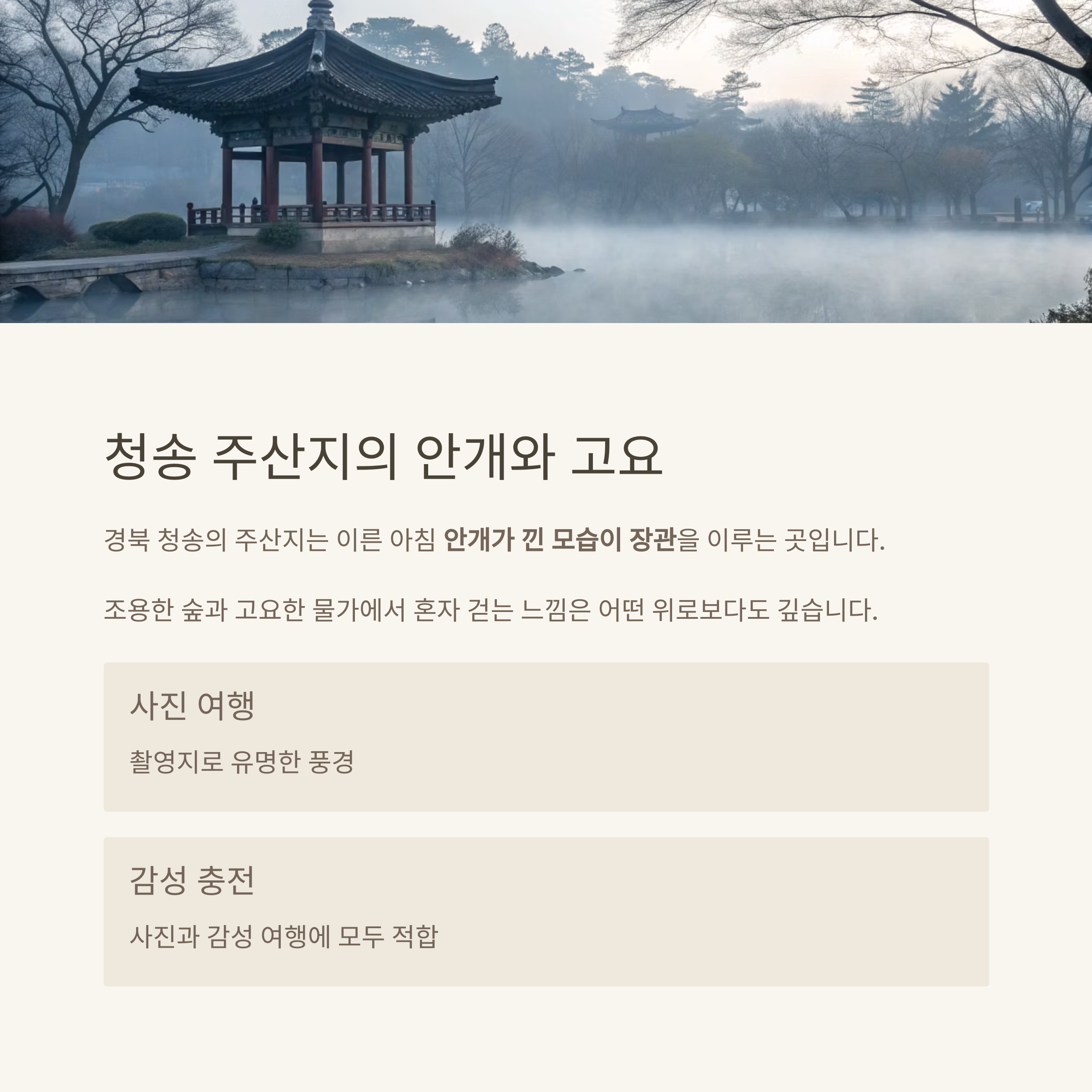 | 청송 주산지 | 안개 명소 | 고요한 자연감성 |