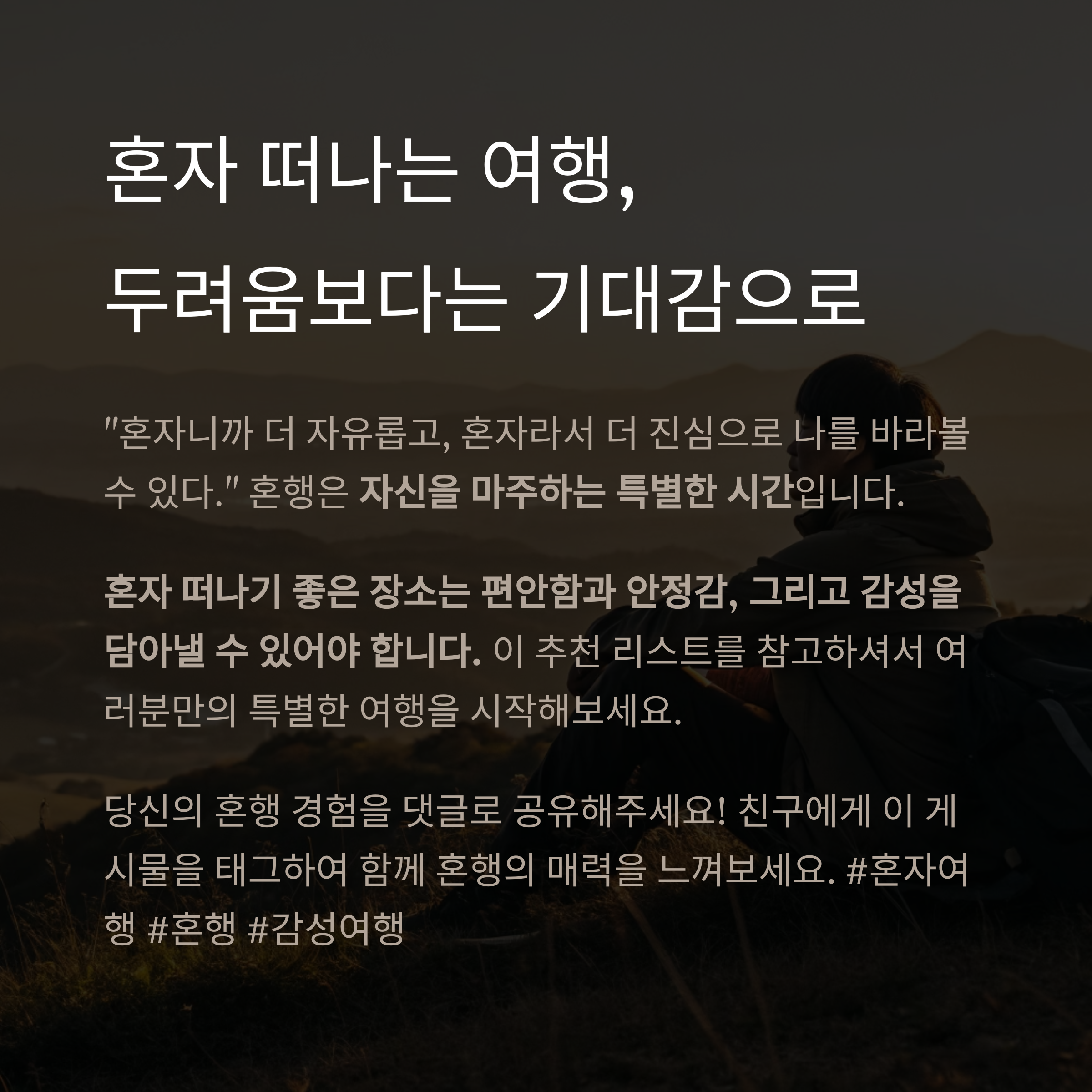 혼행은 외로움을 피하는 여행이 아니라, 자신을 마주하는 특별한 시간입니다.
