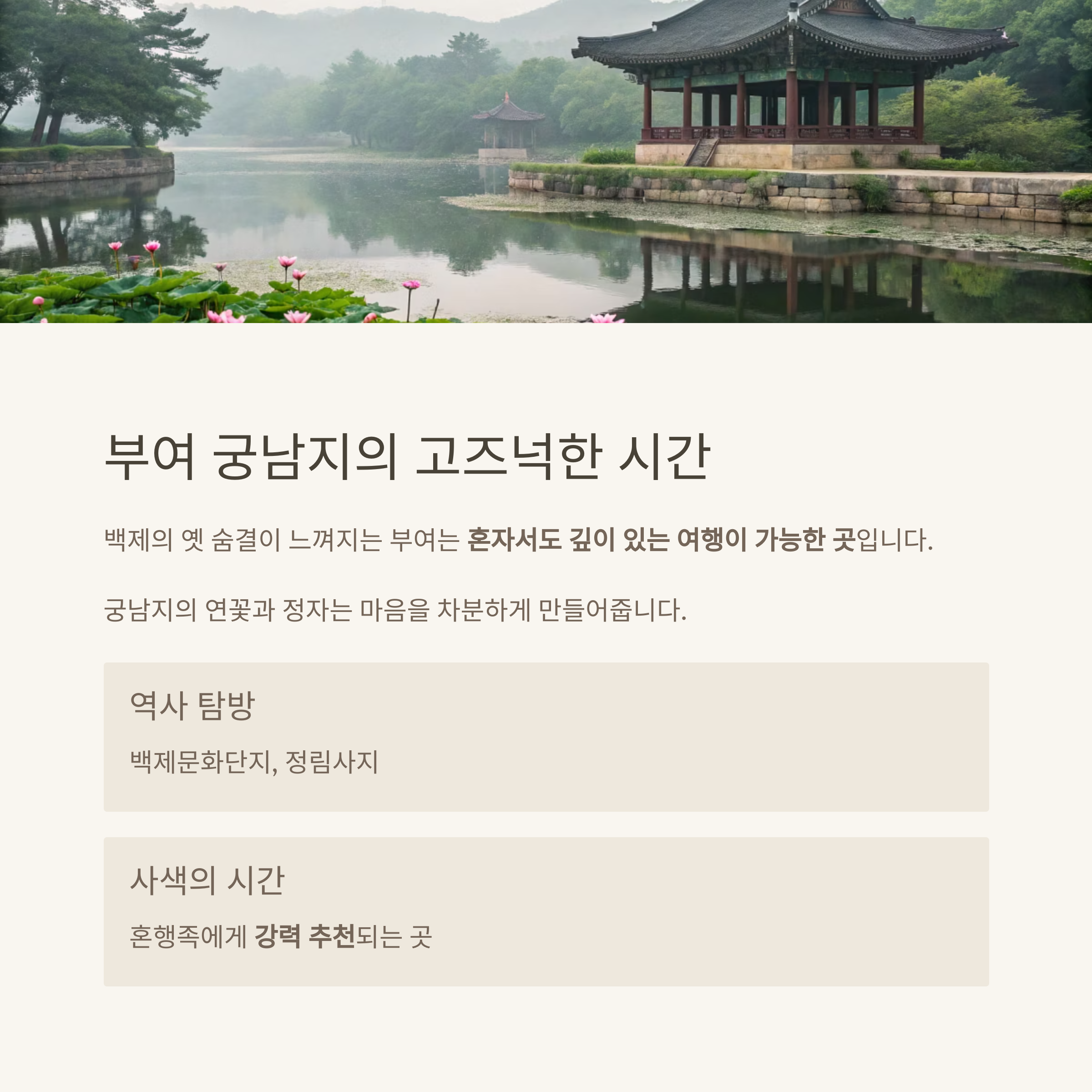 백제의 옛 숨결이 느껴지는 부여는 혼자서도 깊이 있는 여행이 가능한 곳입니다.